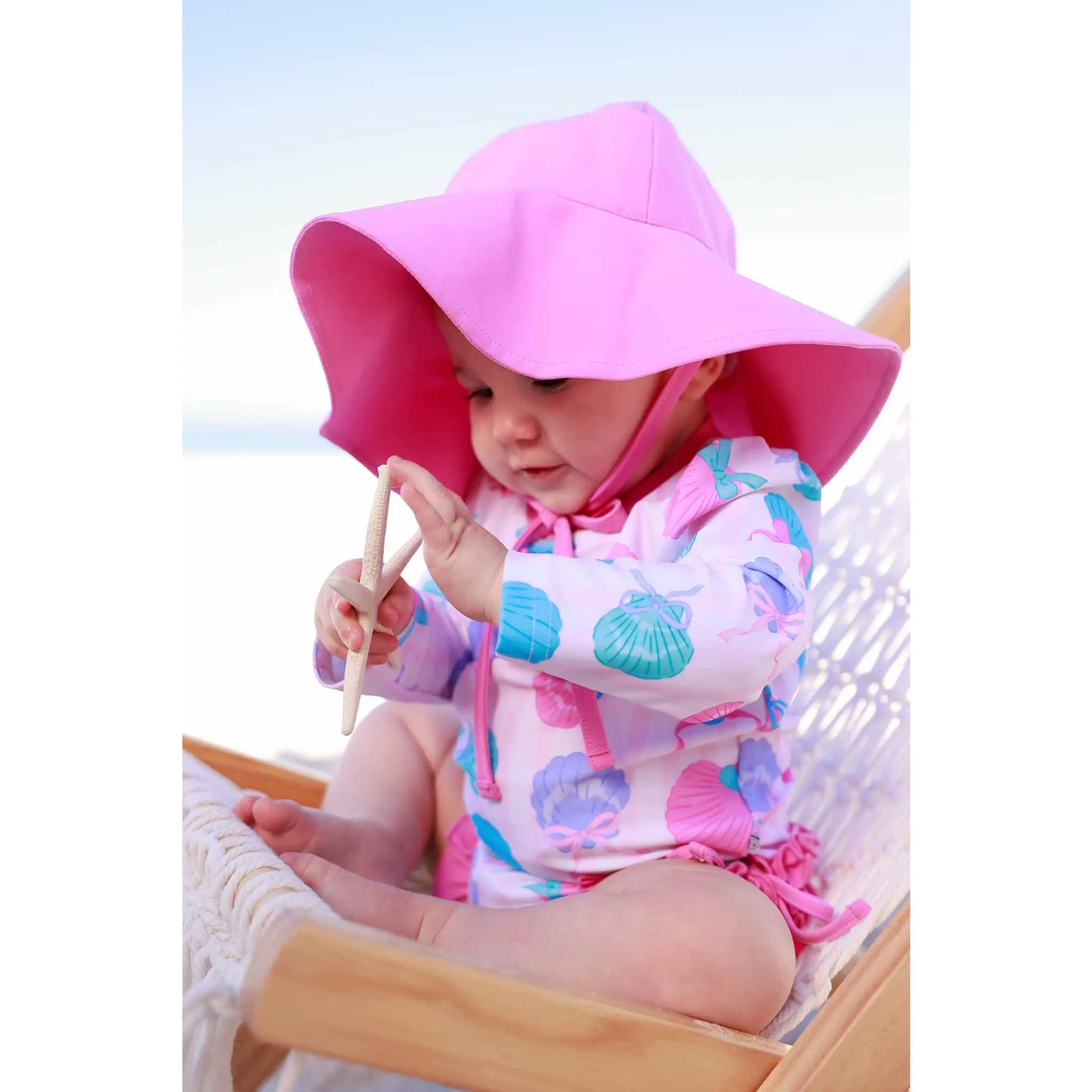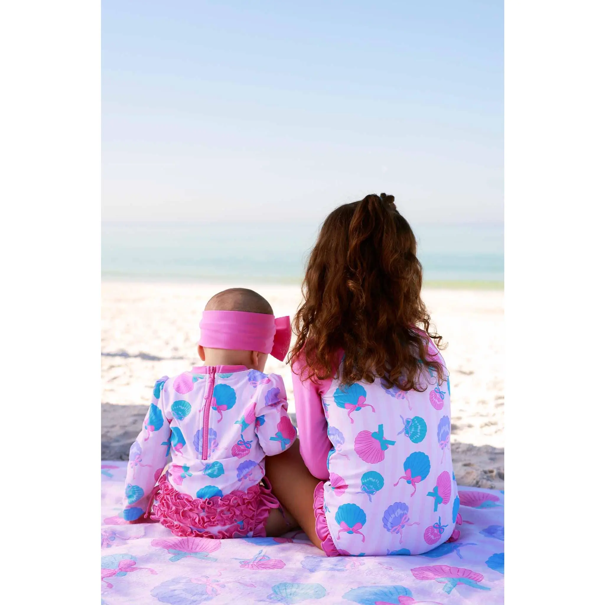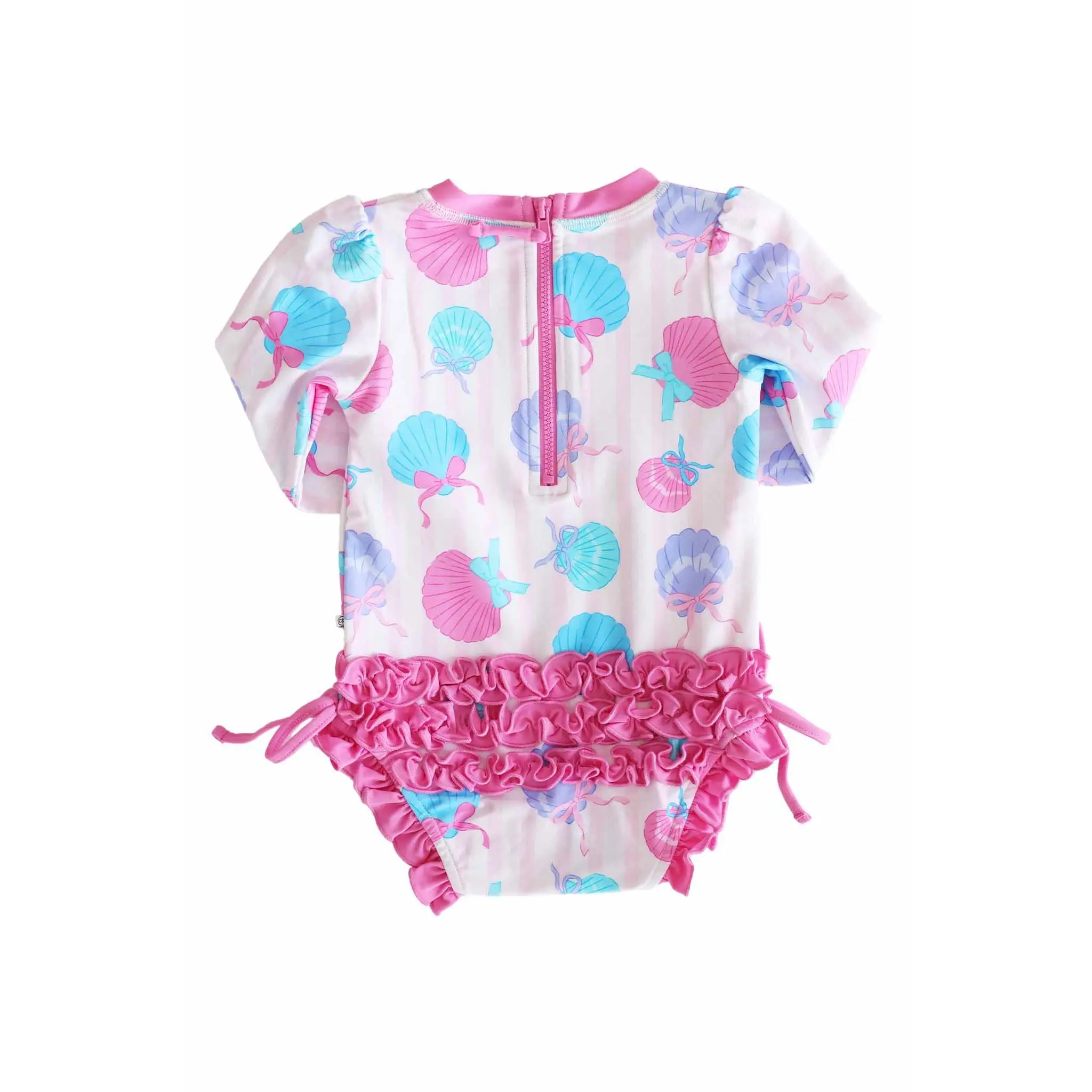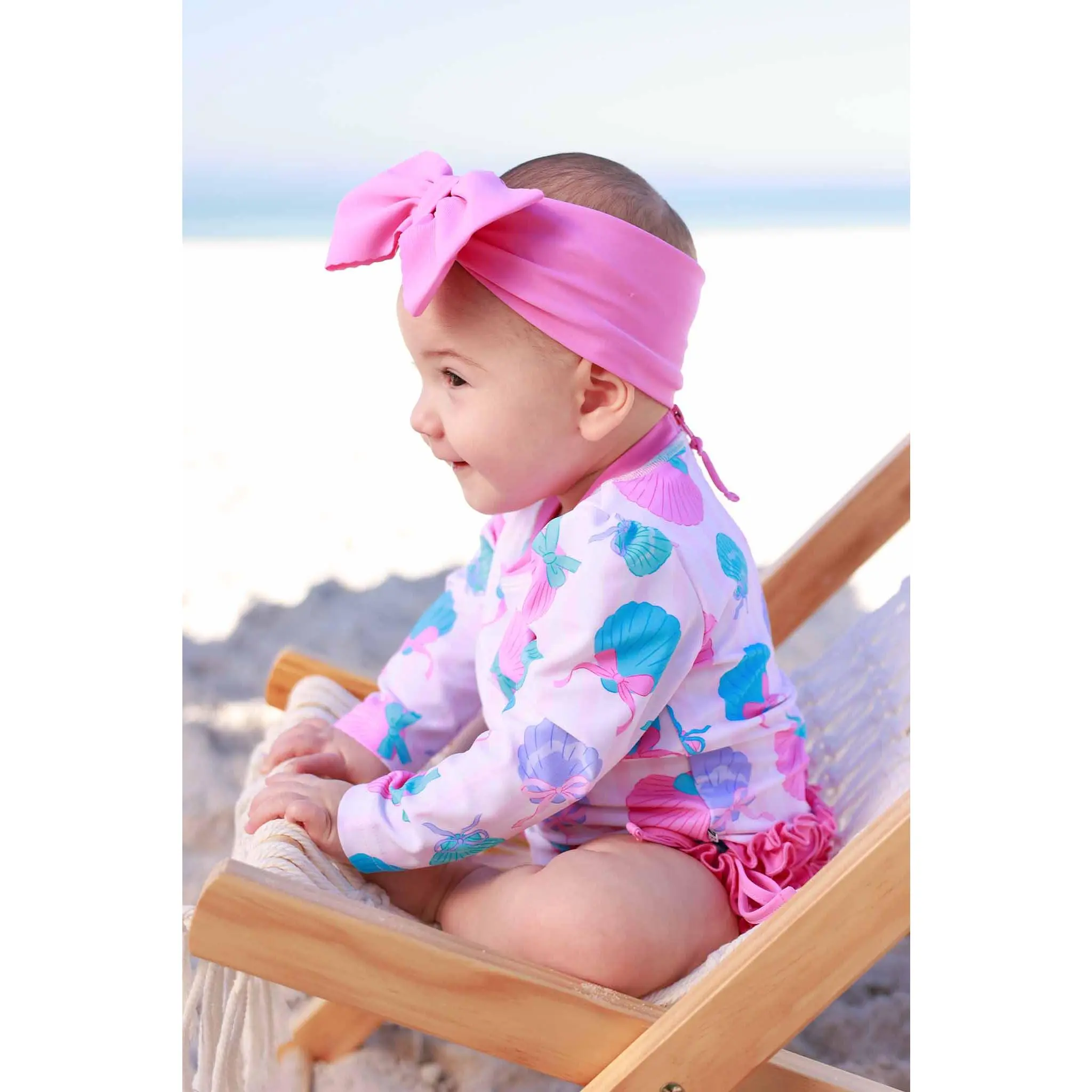 Bring on the sunshine with our Long Sleeve Rash Guard with Ruffle Bottom in Seaside Sweetie! Featuring playful seashells tied up with sweet bows in cheerful pinks and blues, this adorable print is made for beach days, pool parties, and all the summer fun in between. Designed with long sleeves and UPF 50+ fabric, this rash guard helps protect her skin from the sun while she splashes in style.