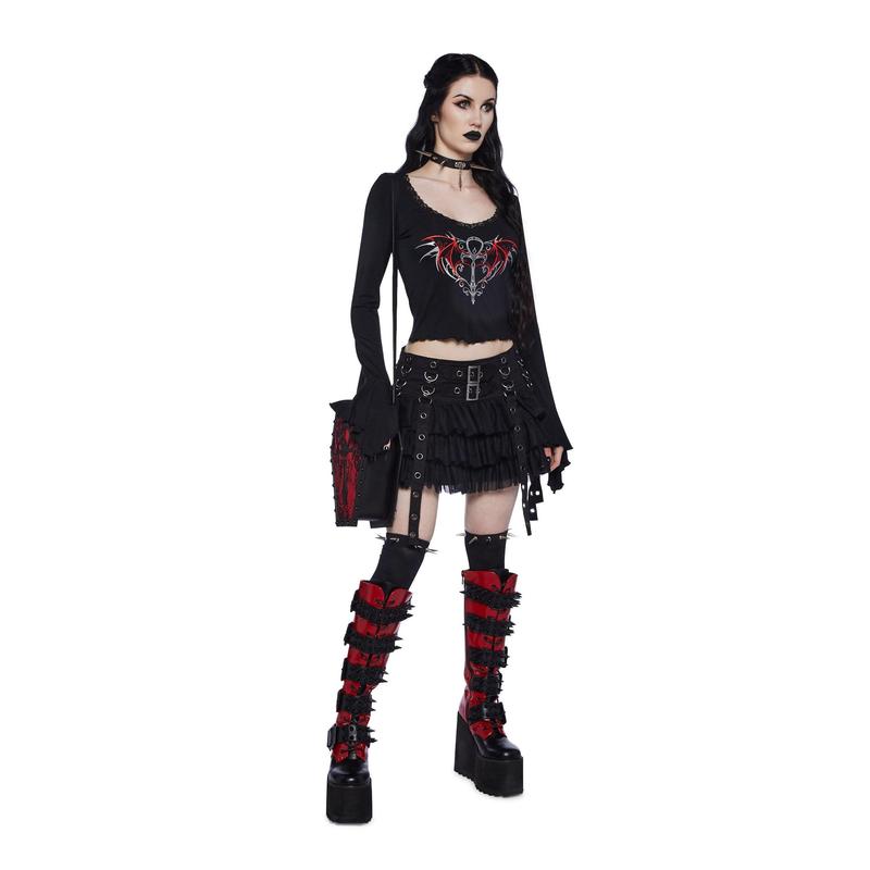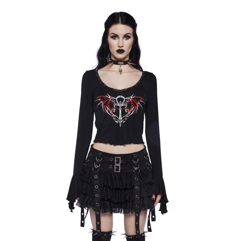 cuz stay away from mirrors. This top has a vampire Ankh symbol graphic print on the front, lace detailing along the neckline, long flared sleeves,and a lettuce hem.