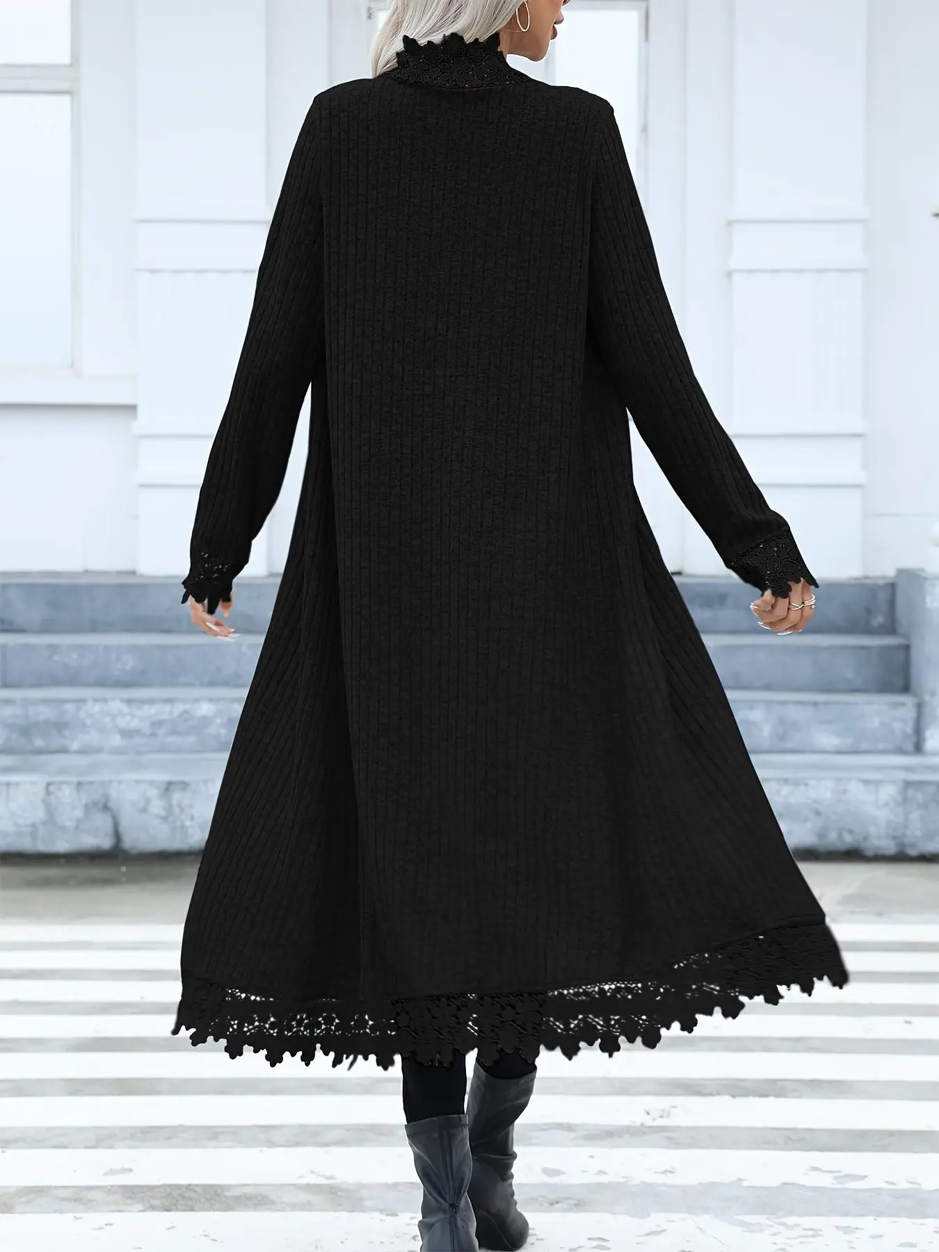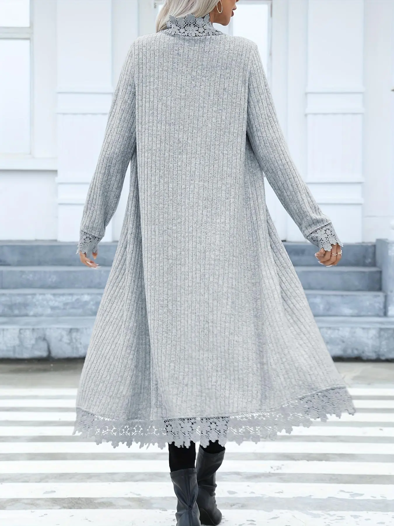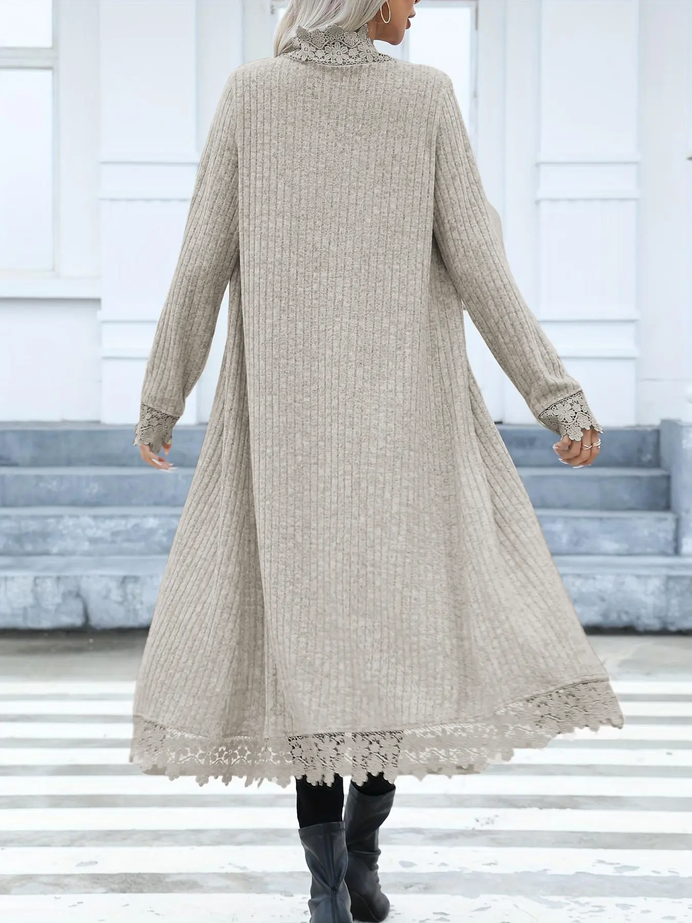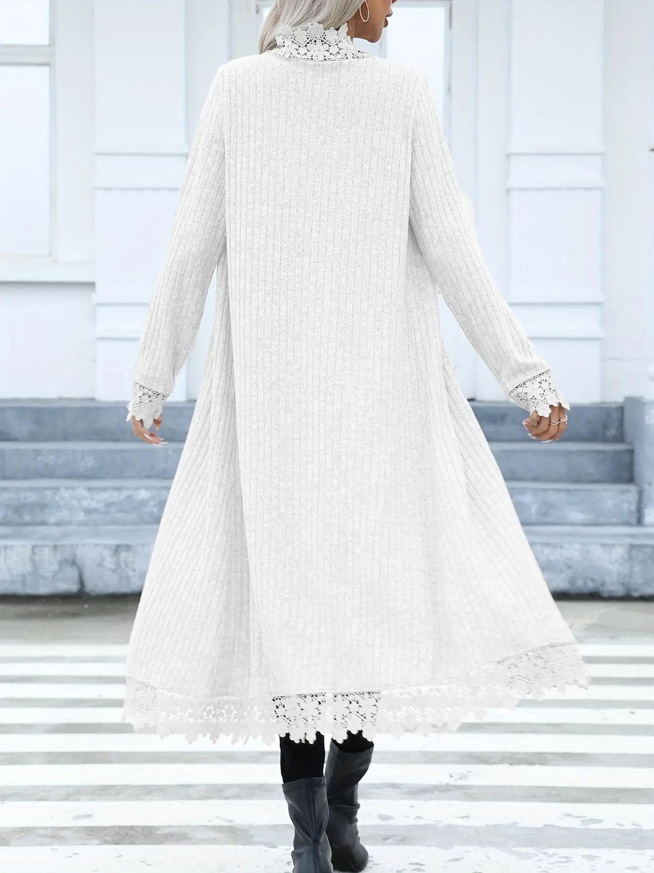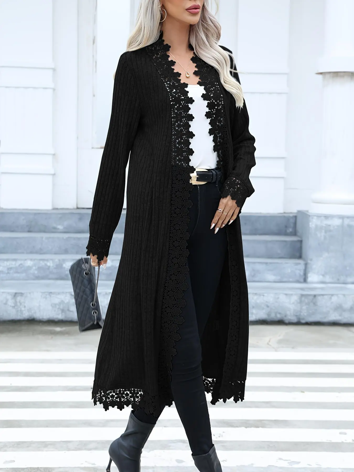 Women's Contrast Lace Open Front Longline Coat, Casual Long Sleeve Ribbed Outerwear for Spring & Fall, Ladies Clothes for Daily Wear