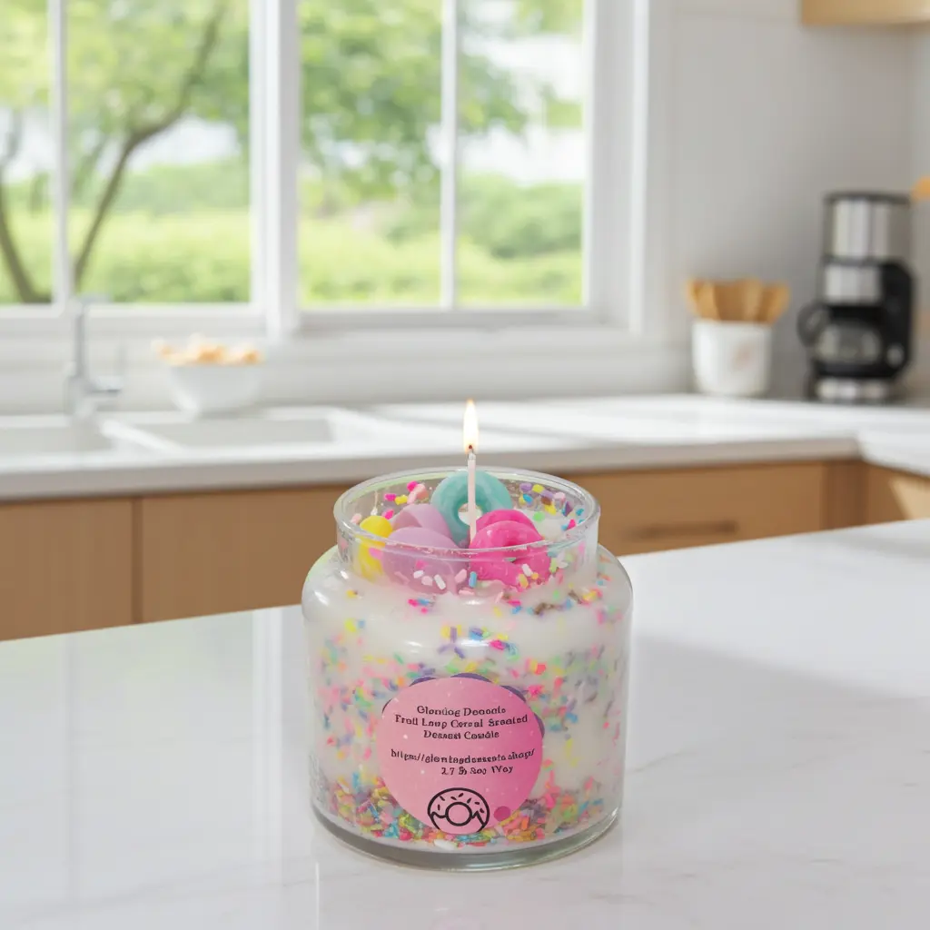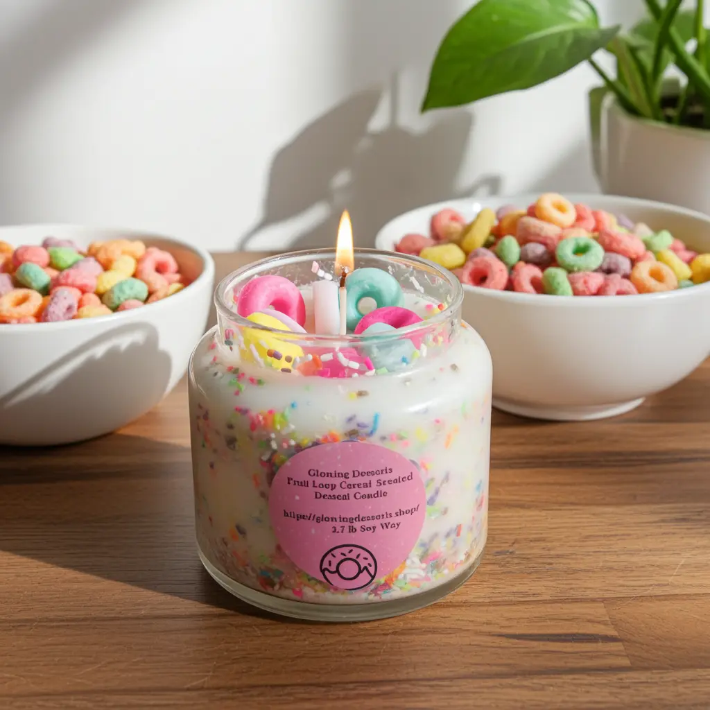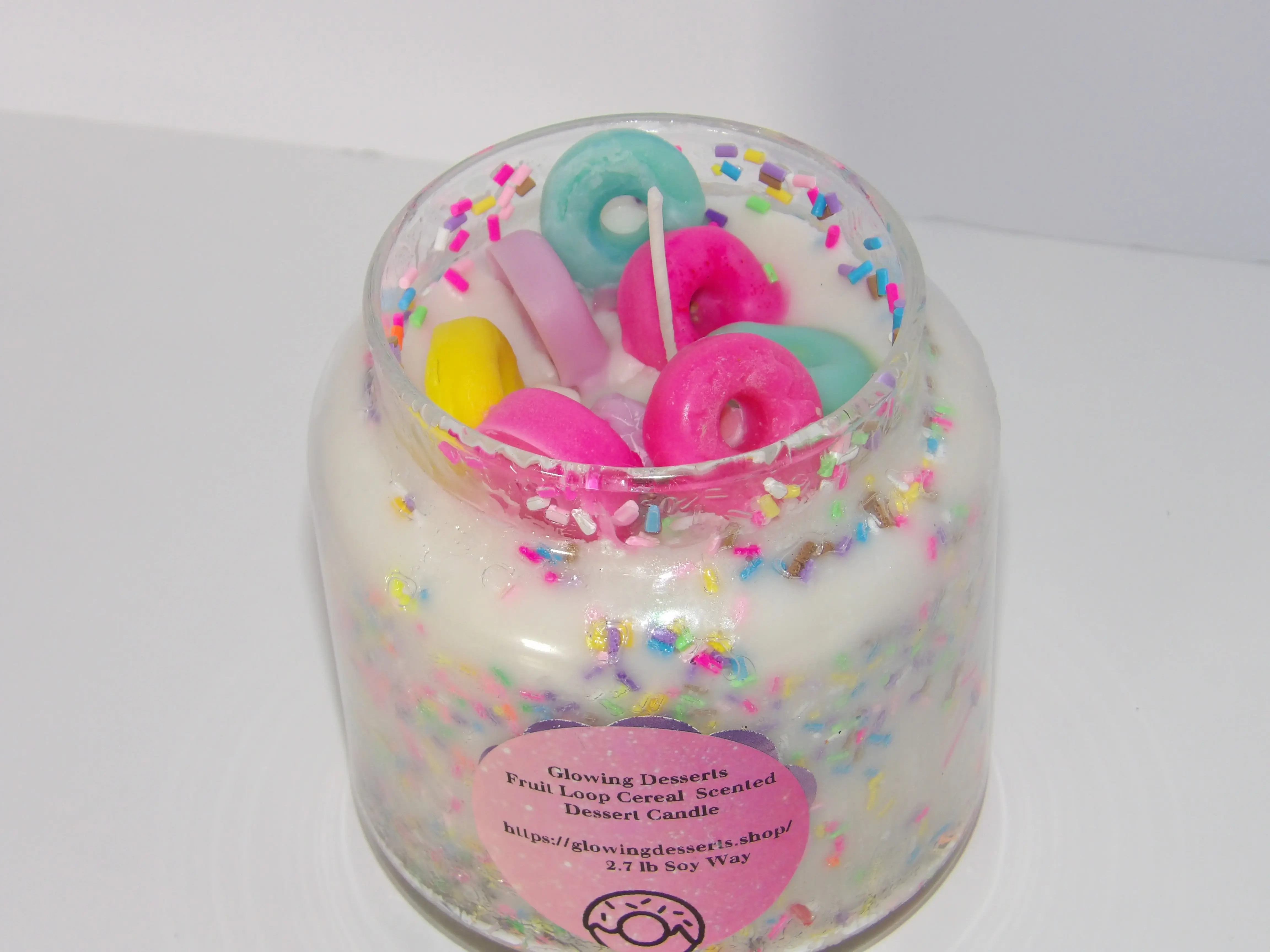 Fruit Loop Cereal Dessert Candle covered in sprinkles and will take you back to eating this fun cereal, this candle has a fruit loop fragrance and is 100%Soy Wax, Hand poured, nontoxic. 2.7 lbs