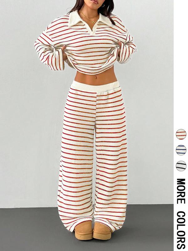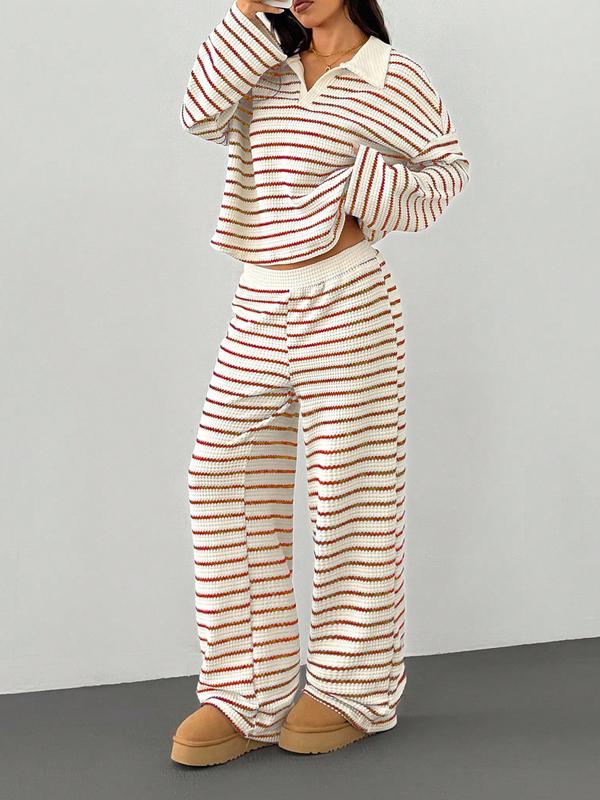 Women's Loose Striped V-Neck Long-Sleeve Top & Elastic Waist Pants Set, Autumn Winter Knitwear Suit, Casual Fashion #pajamaset #loungewearset #winterloungewear #womensclothingtiktokshop #womenssweatshirtset #babytwopieceset #womensjumpsuit #comfy2piecesets #2piecesetoutfit #dropshouldersweatsuit