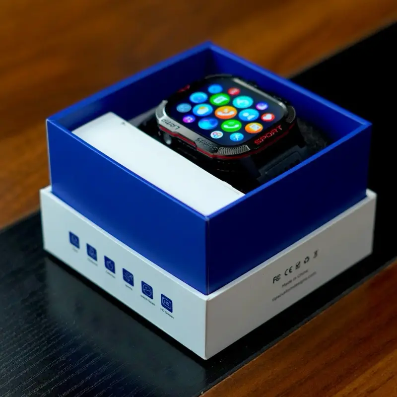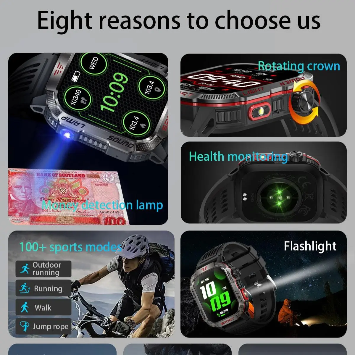 The LOPEZ TIPS SMARTWATCH is designed for men seeking an ultimate outdoor smartwatch. It features an LED flashlight, UV money detector, compass, and altitude sensor. This watch is equipped with an alloy rugged case, ensuring durability. It includes sports fitness modes for tracking your activities. Perfect for outdoor adventures, this smartwatch combines functionality with style.