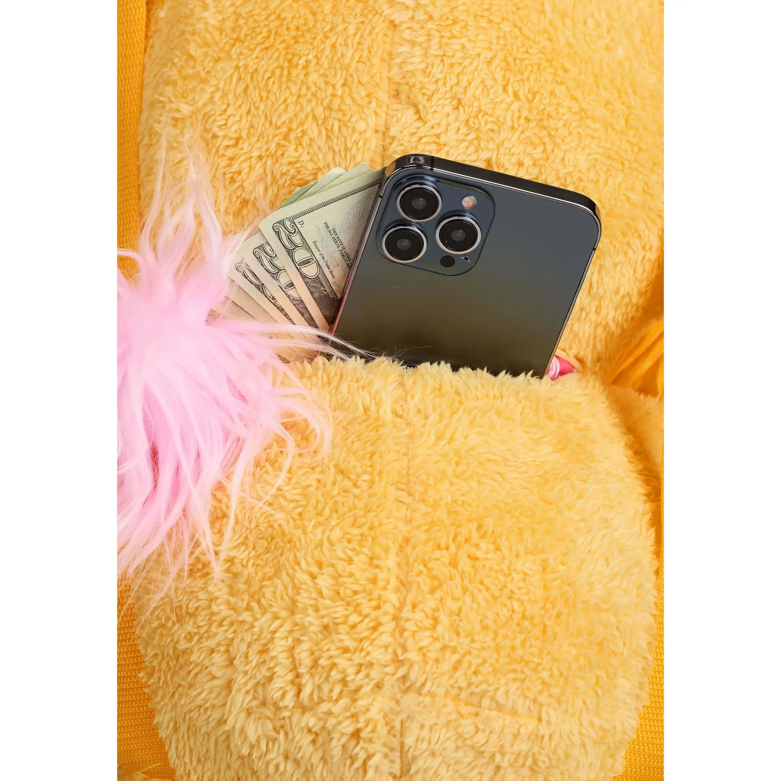 · Horizontal zipper closure on the back opens to a small pocket with poly knit lining, pink pom pom on the zipper