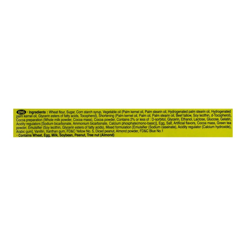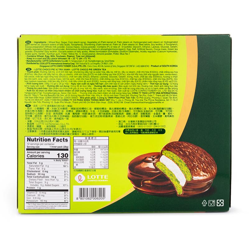 In conclusion, Lotte Choco Pie Green Tea is a pack of 12 delicious and nutritious green tea-flavored cakes that are perfect for snacking. The green tea flavor provides a unique and refreshing taste, while the matcha taste adds a delicate and smooth texture that complements the green tea flavor perfectly. These cakes are a great snack option for those who are always on the go and provide a source of energy and nutrients.