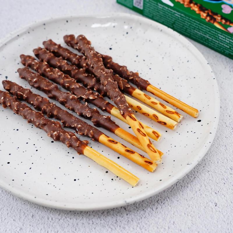 ·Thin biscuit sticks coated in rich chocolate, sprinkled with large almond pieces.