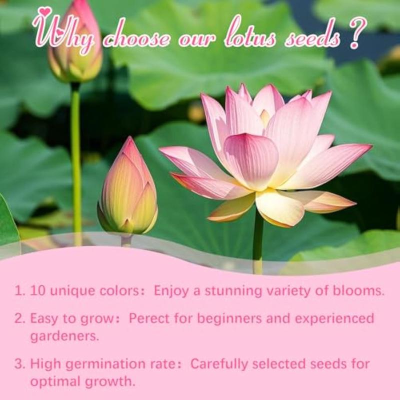Explore a variety of lotus seeds, offering a mix of colors. Perfect for ponds, water gardens, and as a thoughtful gift. Each pack contains 20 seeds, ensuring you have plenty for your projects. The seeds come with a detailed planting guide, making it easy to start growing. Enjoy the benefits of high germination rates and hassle-free cultivation.