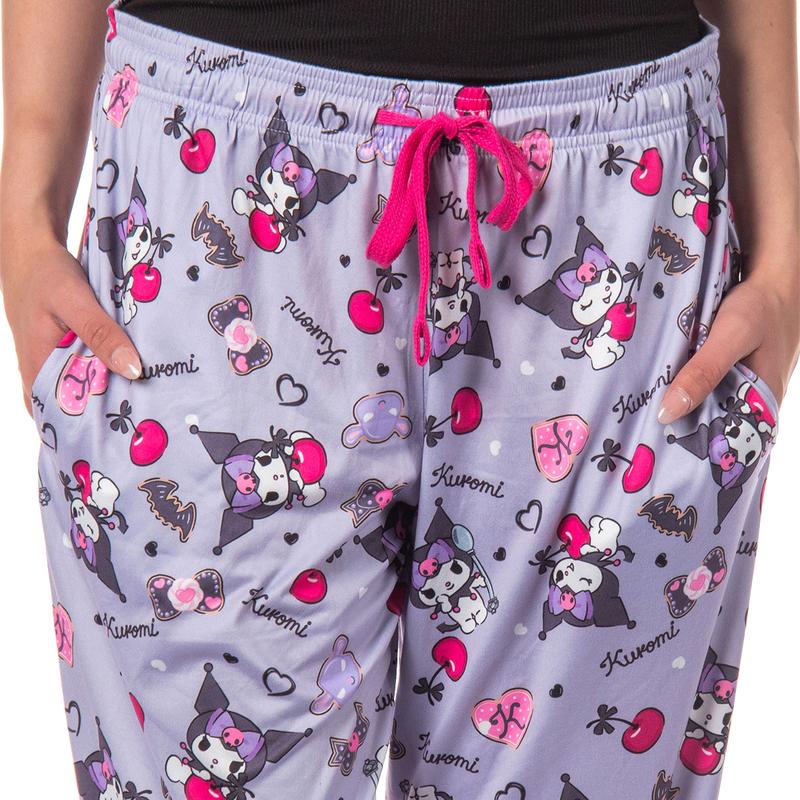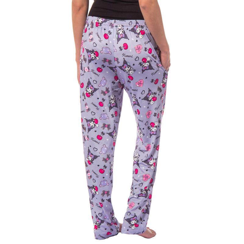 These Kuromi lounge pants are the great combination of comfort, style, and a touch of mischief. These light purple/grey lounge pants feature the beloved Kuromi in an all-over print design, adding edgy charm to your loungewear collection. These pants are made with a soft polyester/spandex fabric that will keep you super comfortable, making them ideal for lazy weekends, evenings at home, or casual outings. You'll want to add these Kuromi pants to your wardrobe asap. THESE THE KUROMI PAJAMA PANTS ARE MERCHANDISE - These pants are great for fans of Kuromi who are drawn to its distinctive design, expressive personality, and relatability for those who appreciate a bit of an alternative aesthetic CUTE DESIGN - These light purple/grey lounge pants feature the trendy and beloved Kuromi in an all-over print design. These pants showcase a distinctive and eye-catching goth-inspired print that features Kuromi's adorable face and amazing black skull hat, adding a rebellious flair to your loungewear collection. SUPER SOFT FEEL - The soft fabric ensures a gentle feel against your skin, allowing you to unwind and relax comfortably. The waist features a drawstring closure to help keep your pants snug-fitting at your waistline. The pants also feature pockets because all PJ pants should have pockets to hold your cell phone and keys. They will have you longing to get back home and snuggle up to your favorite movie, television show, or book great GIFT FOR ANY OCCASION - Versatility is key with these lounge pants, as they can be easily paired with your favorite t-shirts, tank tops, or hoodies for a relaxed and stylish ensemble. Whether you're cosplaying, attending a sleepover, or simply expressing your love for the Sanrio character, these pants are a must-have addition to your wardrobe. SIZING AND WASH INSTRUCTIONS - Listed in women's sizing but made for all older fans. For visual reference, the model is 5ft 8in and wearing a size medium.