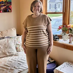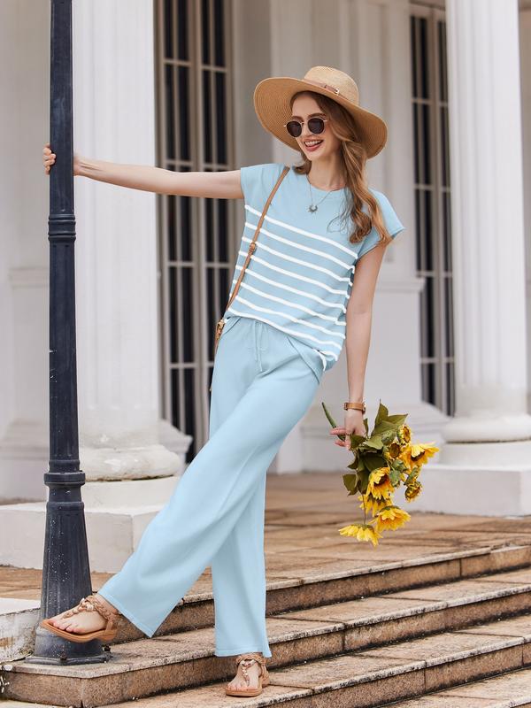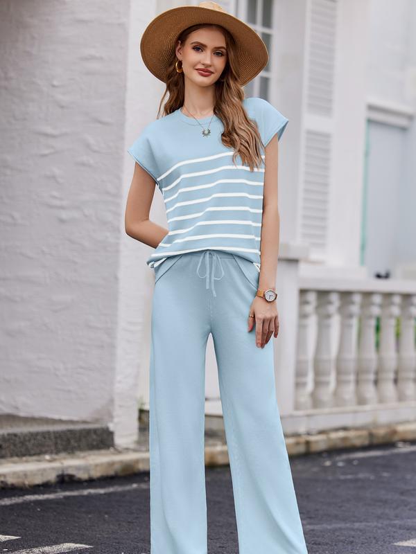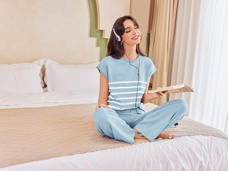 ·Striped Sweater Top: This 2 piece sweater outfits for women features a pullover striped top with cap sleeves,crew neck sweatershirt.Paired with matching shorts, skirts, jeans, leggings, or pants, offering both comfort pjs set and chic street look.