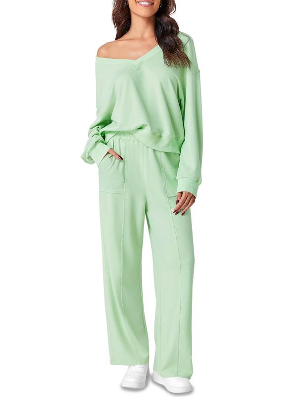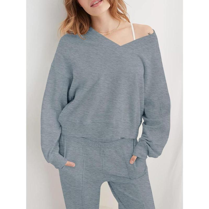 Elevate your look with our two-piece outfit. This sweat set features a cozy V Neck long sleeve pullover top and elastic waistband pants for a stylish yet comfortable ensemble.