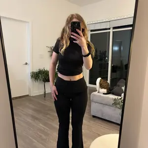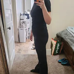 I love this set! It is stretchy, comfy, soft, and flattering. You can create a low rise look with the pants by folding them down or a high-rise look, and crop the tee by folding it up or just keep it long.