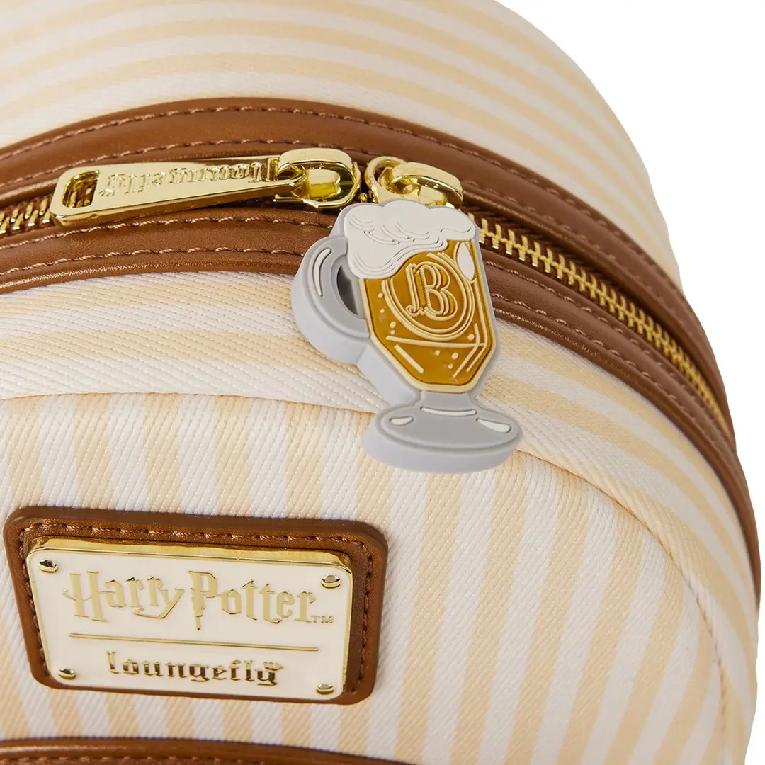 A magical style for all the witches, wizards, and muggles that adore Butterbeer! The star of this bag is the circular front pocket that looks like a Butterbeer barrel with gold-foil Butterbeer logo and a molded metal charm of a spigot. It coordinates beautifully with a yellow-and-cream striped background on the rest of the bag. More magical details appear on the bag, including a Butterbeer zipper pull and another shining foil Butterbeer logo on the side pocket. Oh, and the best part? It's butterscotch scented!