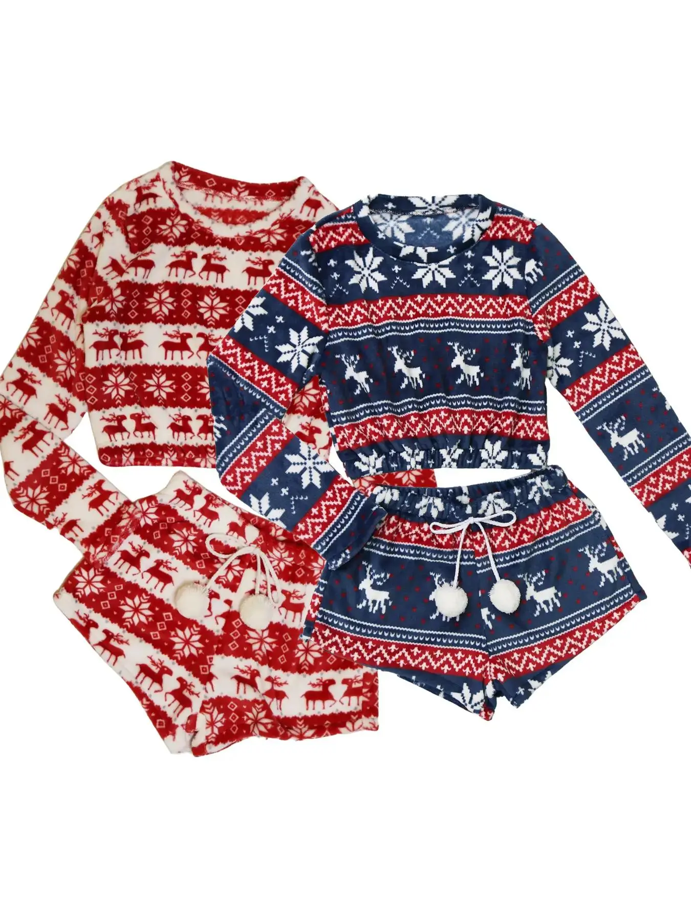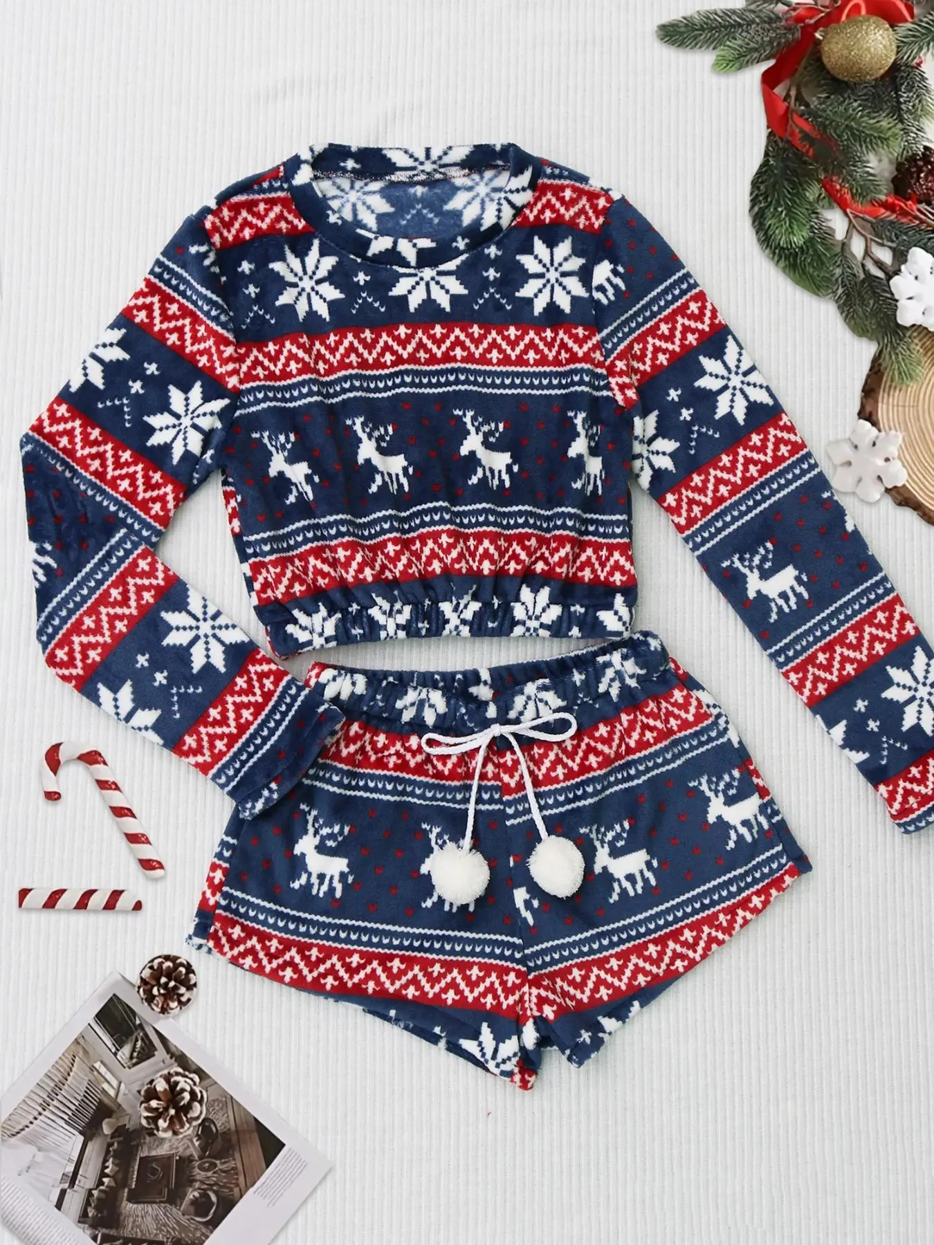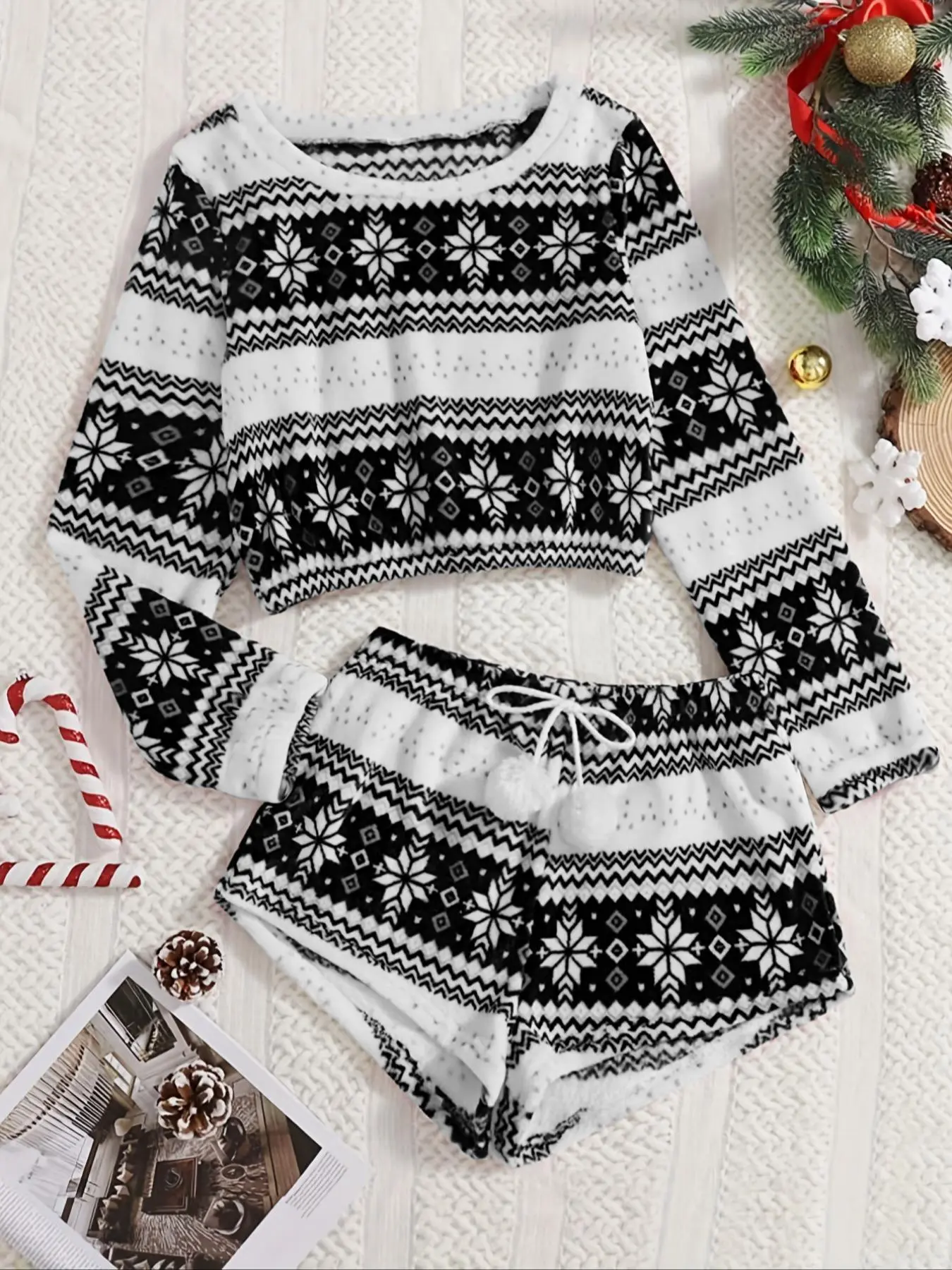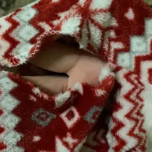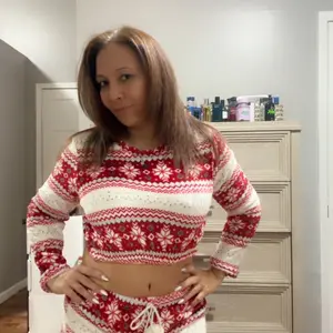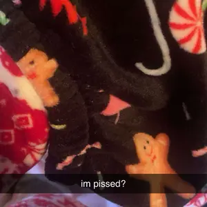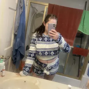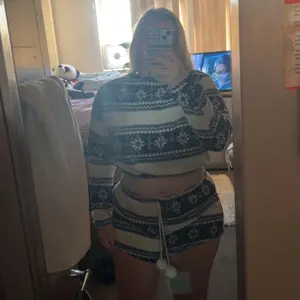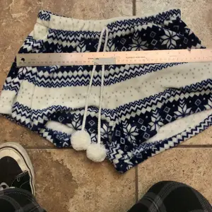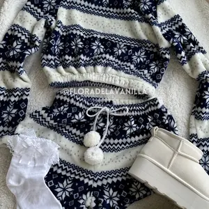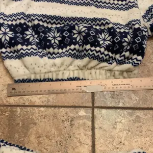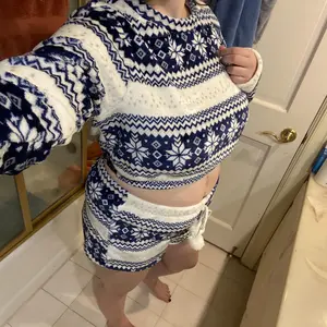 SO COZY!!!❄️ the fabric is soft on both sides! plush fleece? idk but it’s 🤌 the pom strings are just for show but the waist band is very stretchy! (just note that the neck hole & sleeve holes aren’t very stretchy.) i got a size small in the blue fairisle print & the fit was perfect for me! LOVE🤍