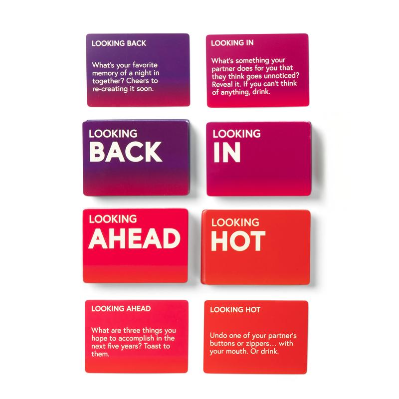 How to Play: Pour a drink, and draw 5 cards each from Looking Back, Looking In, and Looking Ahead. Take turns answering prompts and sipping as you go. End the night by drawing 3 Looking Hot cards for a playful grand finale. This spicy couples drinking game for adults is sure to turn up the heat.