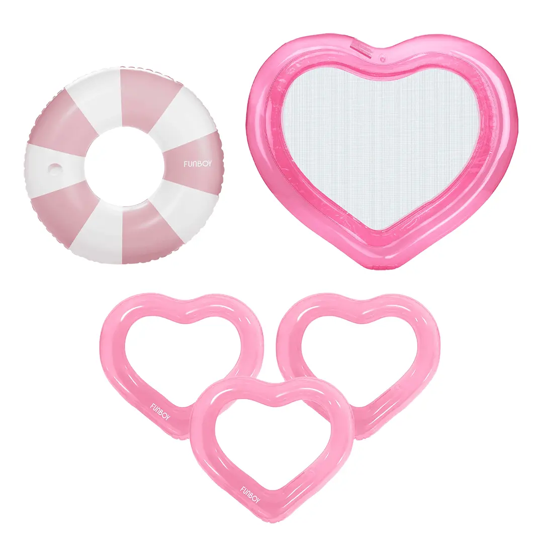 Every great love story starts with the perfect float. The Love Story bundle includes the Mesh Heart Water Hammock for dreamy relaxation, the Upcycled Heart Tube Float for sustainable style, and the Pink Vintage Stripe Tube Float for a classic touch. Just add sunshine and good company.