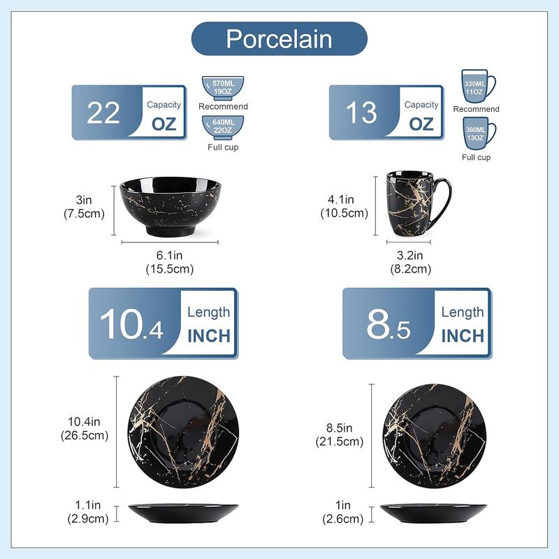 LOVECASA Sweet series, 16-piece porcelain tableware set with a colour glaze, with a gold-plated porcelain set, kitchenware with dinner plates, dessert plates, bowls and cups, for 4 people, thicker and smoother, more delicate and durable. Whether in the kitchen or living room, it is perfect decoration, it can be easily combined with existing tableware in your kitchen. Non-stick glazed surface, easy to clean, microwave-safe and dishwasher-safe.