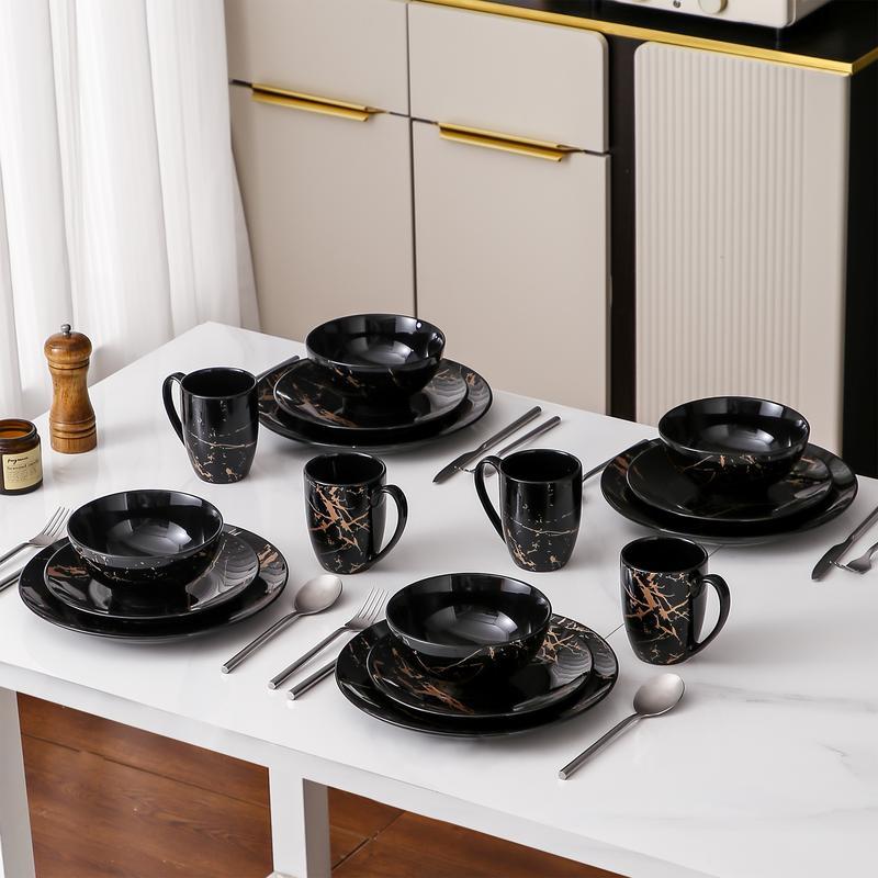 Pure nature tint, elegant modern look, hot splash gold design and beautiful smooth glaze, our LOVECASA crockery set is an eye-catcher on your laid table. Due to the unique design, the pattern of each tableware set has its own characteristics. Thanks to the glazed surface, the tableware set is easy to clean.