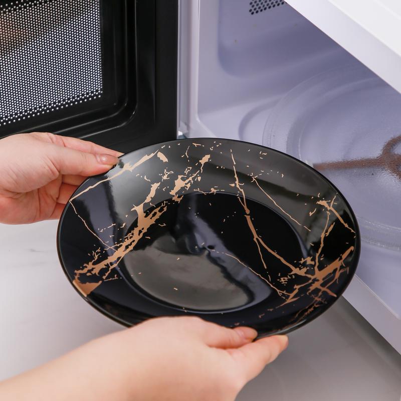 Our dinner plate sets are made of high quality China, smooth glazed, featured gold splash coating, non-slip underside, durable, simple and generous