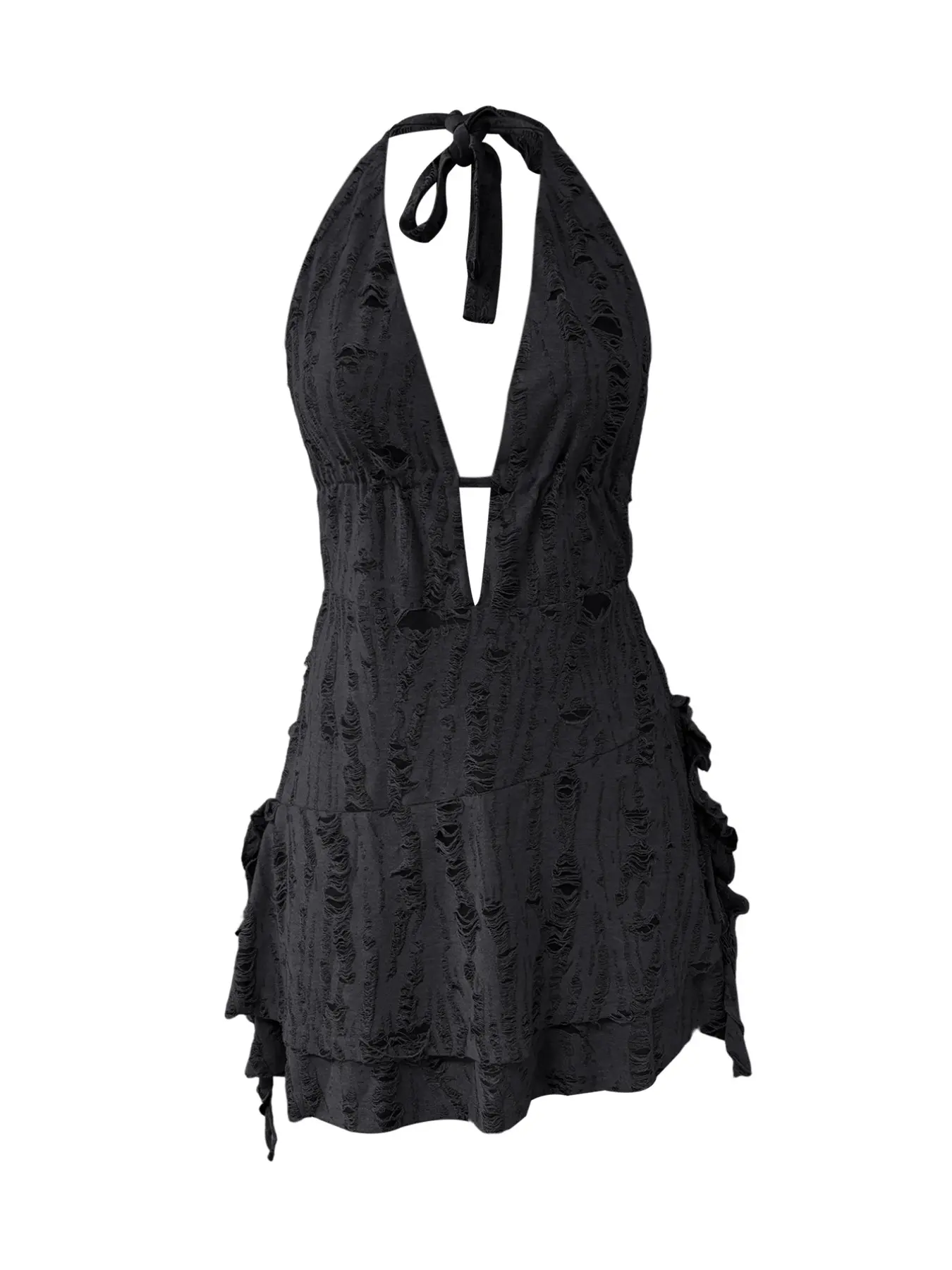 5. LovelyWholesale Women's Summer Vacation Solid Color Ripped Design Asymmetrical Hem Tie Halter Backless Sexy Mini Dress, Sexy Style, Perfect for Vacations
