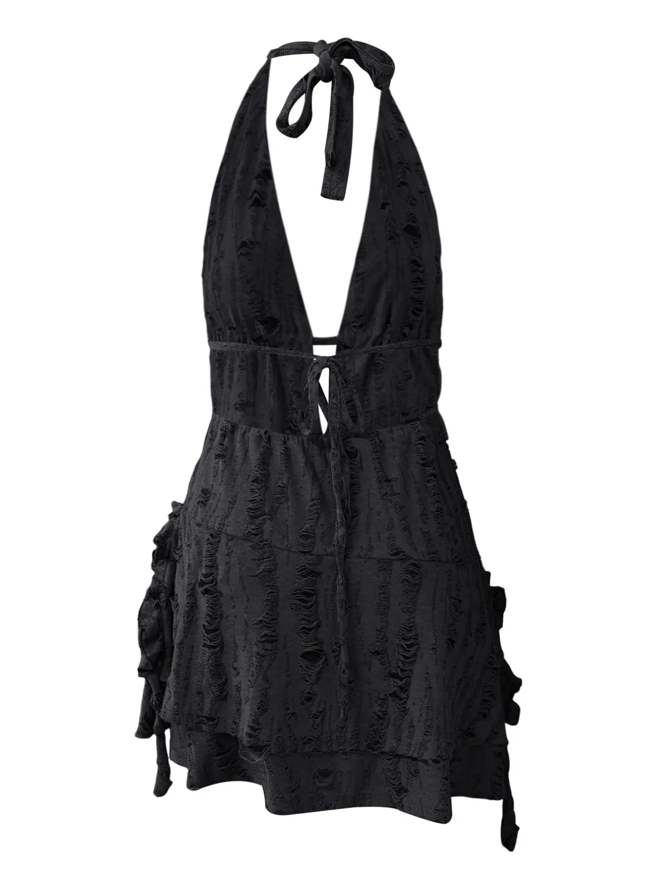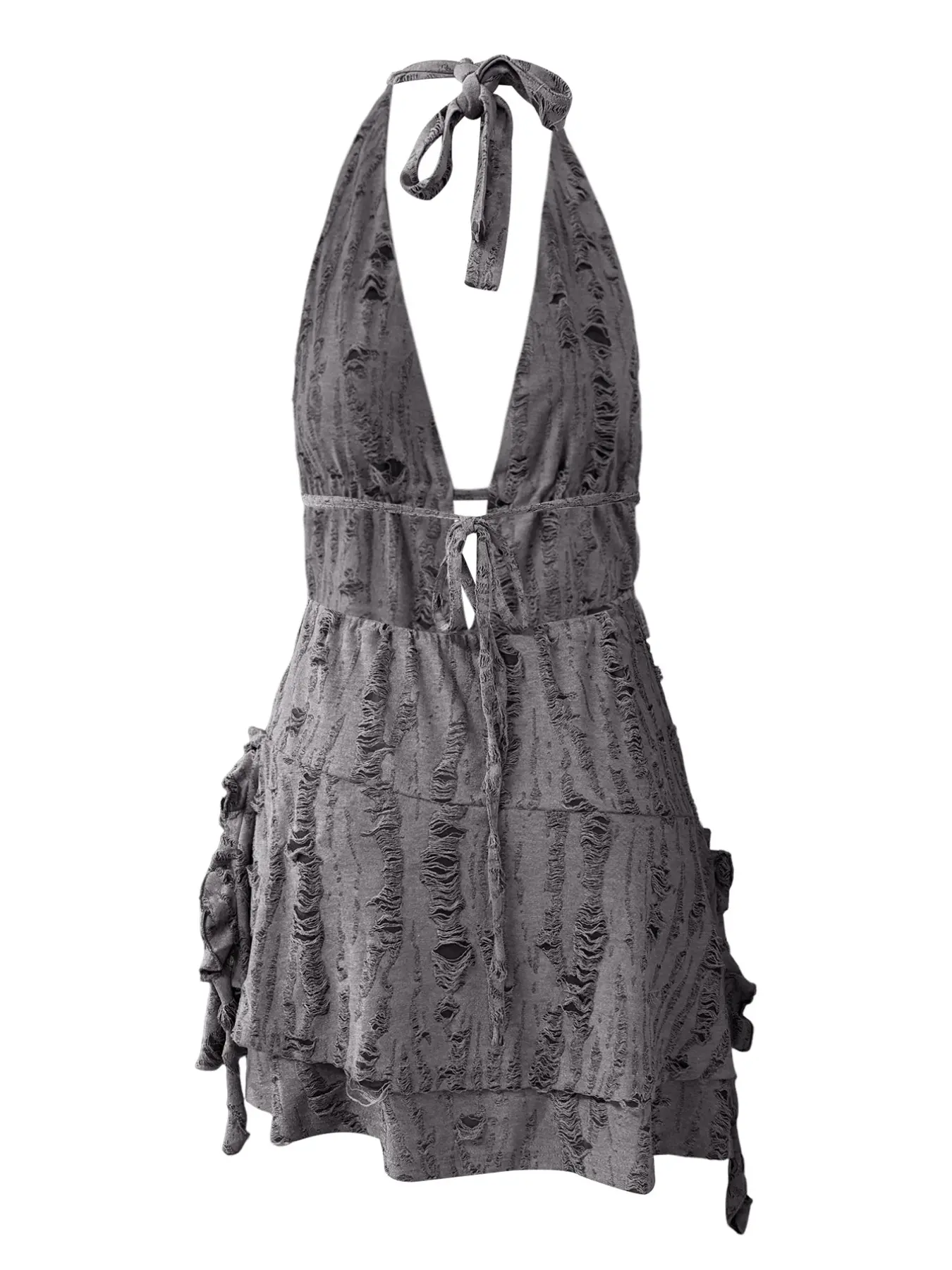 LovelyWholesale Women's Summer Vacation Solid Color Ripped Design Asymmetrical Hem Tie Halter Backless Sexy Mini Dress, Sexy Style, Perfect for Vacations