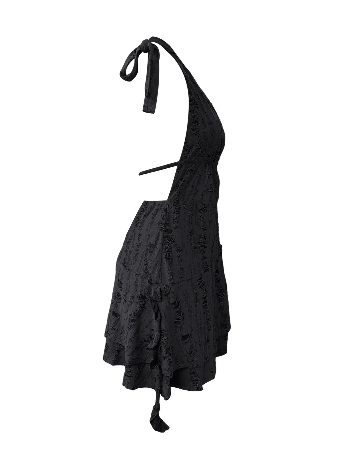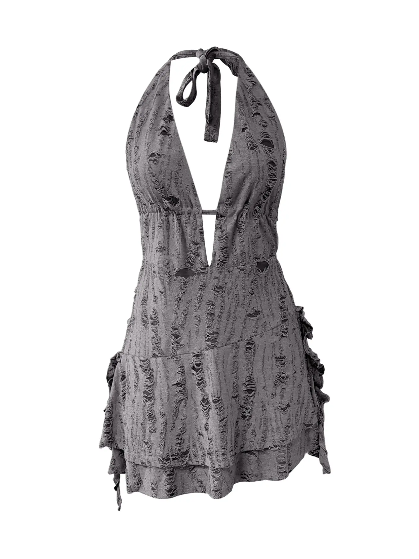 LovelyWholesale Women's Summer Vacation Solid Color Ripped Design Asymmetrical Hem Tie Halter Backless Sexy Mini Dress #sexy #dress #spotlightfinds #tiktokshop #fyp