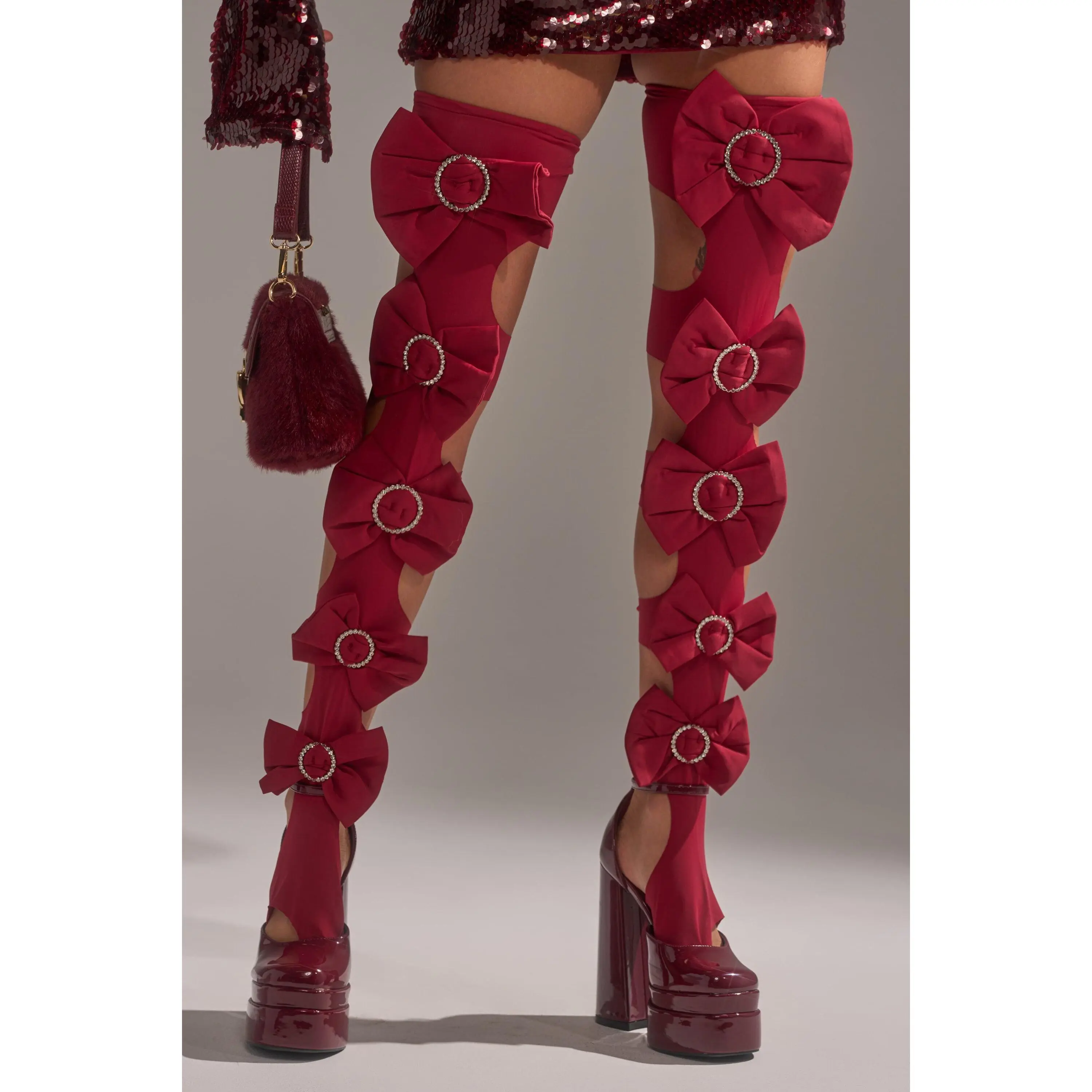 The AKIRA Label Loves Me Stirrup Stockings transform any outfit with their dramatic cutout design, featuring cascading oversized bows adorned with sparkling rhinestone circle buckles that run down the front of each leg finished with a stirrup bottom. Crafted from a structured, stretchy fabric that hugs the body, these cut-out stockings combine sculptural detailing with glamorous embellishment, creating a striking look from head to toe. - 92% Nylon 18% Spandex- Super Stretchy- Imported(all measurements are approximate from size O/S)- 28” Total Length (unstretched)Product ID: 1074931