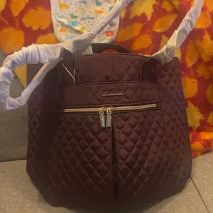 This backpack offers the versatility of a hybrid backpack and handbag, with handles on the top and side.