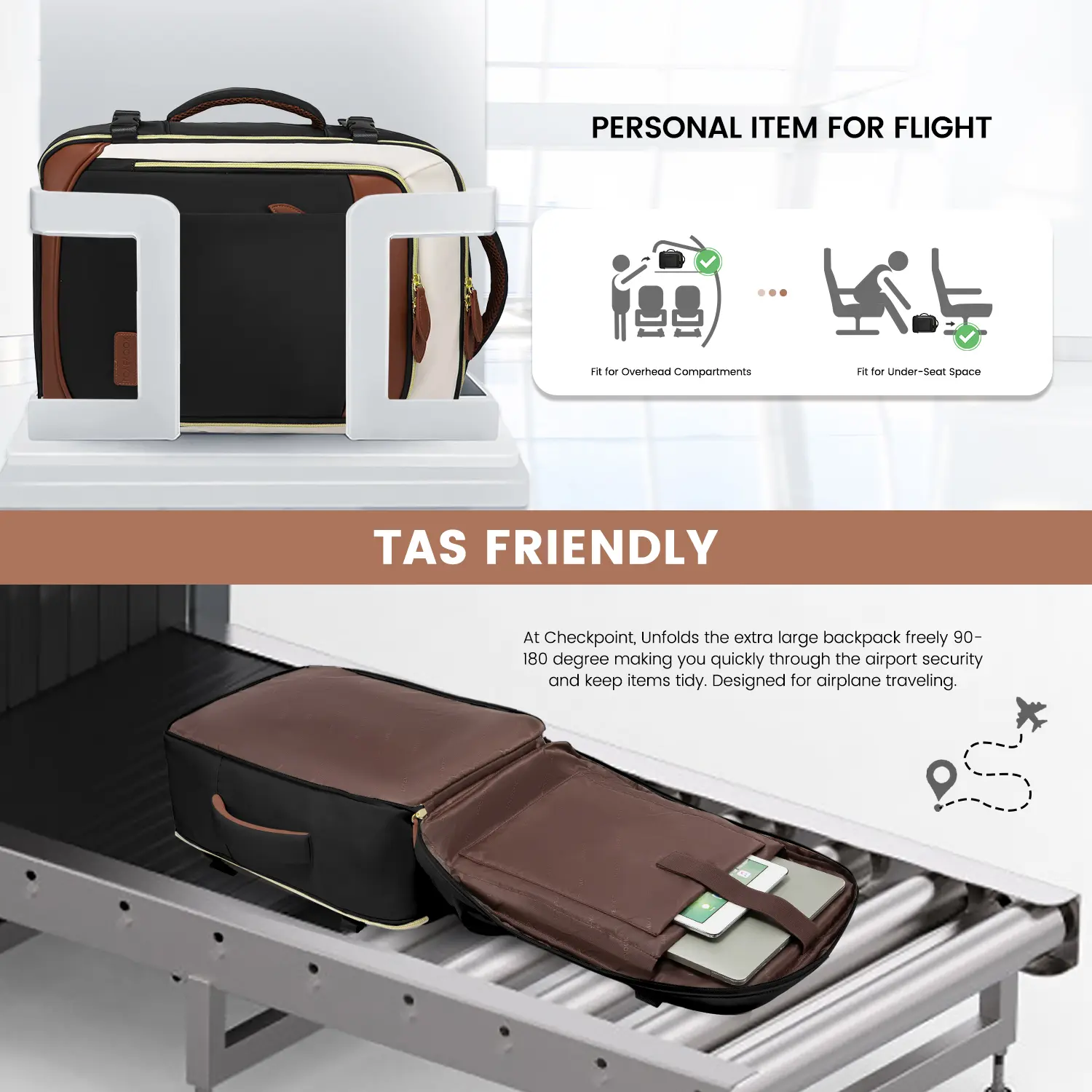 This TSA-approved travel backpack opens 90-180 degrees for quick and easy security checks. It fits in overhead compartments and under airplane seats. For a hassle-free travel experience, avoid overpacking when using it as a personal item.