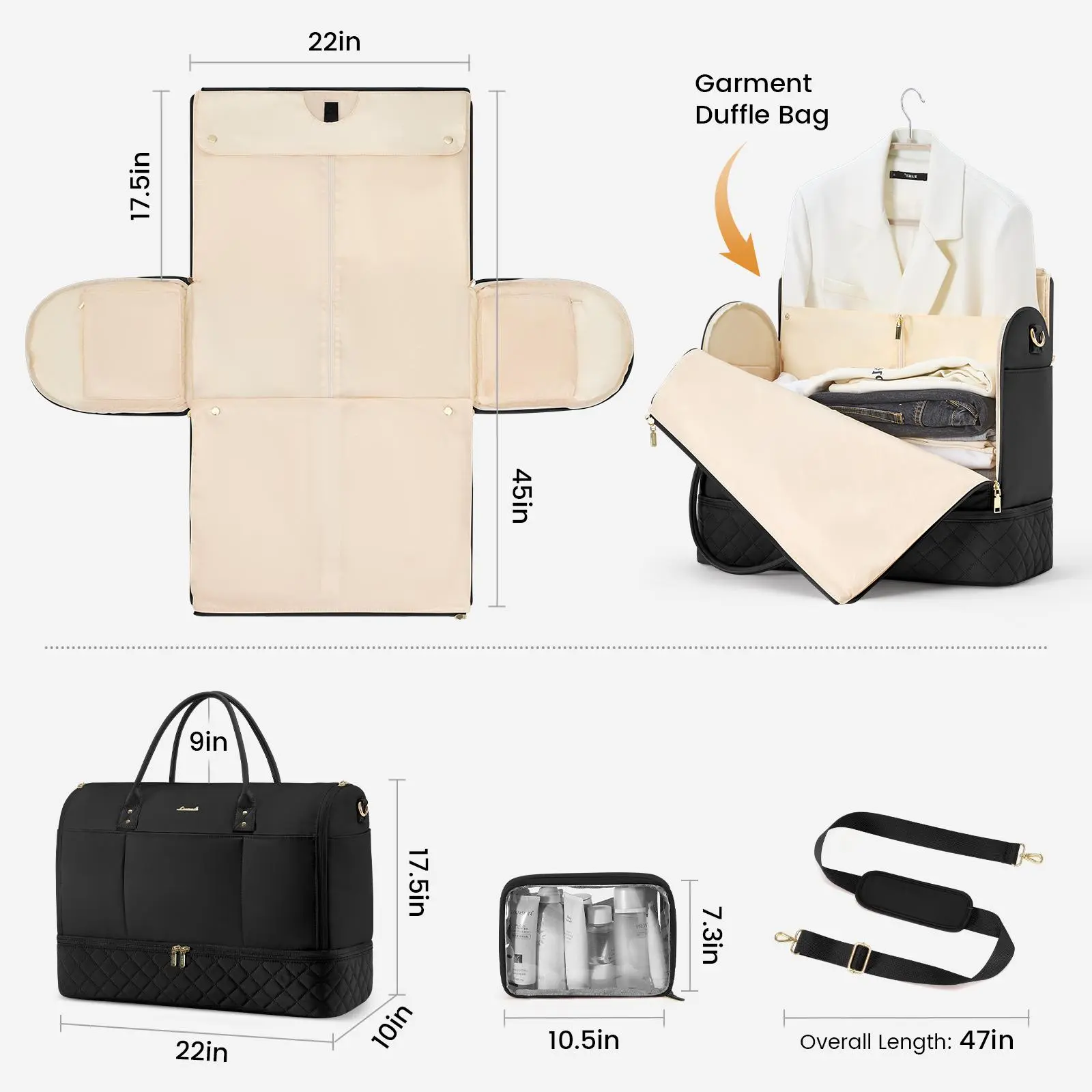 This is a great travel bag! It has so much room, it’s also a garment bag for hanging clothes, plenty of space for shoes, shorts tops and all other clothing and accessories