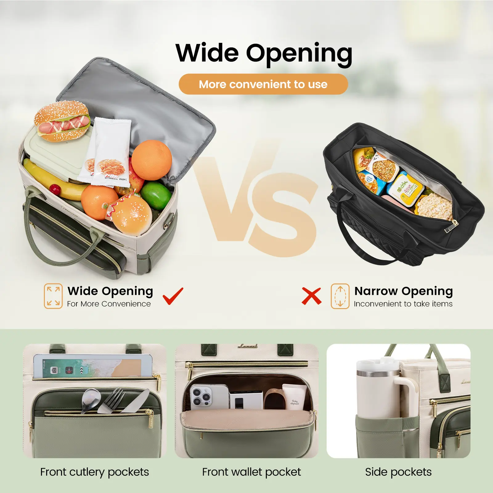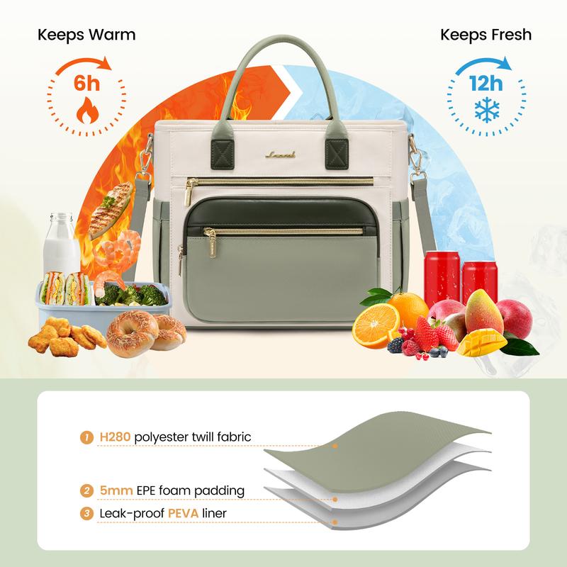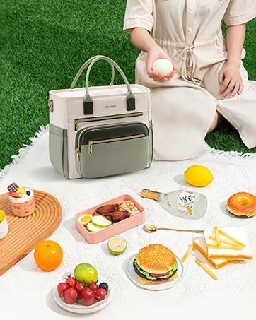 ·Innovative Wide Opening Design and Multiple Pockets: The top of the lovevook lunch bag adopts a large opening design, which is convenient for one-handed quick removal of lunch boxes, fruits, etc. Say goodbye to the "difficulty of reaching" of traditional narrow lunch bags. The three front pockets can hold daily necessities such as tableware, mobile phones, wallets, cosmetics, etc., and the two elastic pockets on the side can hold large water bottles.