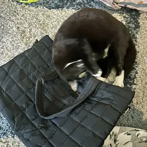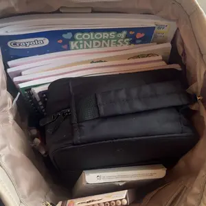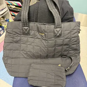 This bag is great! Fits my laptop if I need to bring it, my iPad, Bible, pens and notes, wallet, everything! Room for water bottle and snacks if needed and has an outside zipper too! AND it has a smaller bag too. Oh and Stella loves it too.