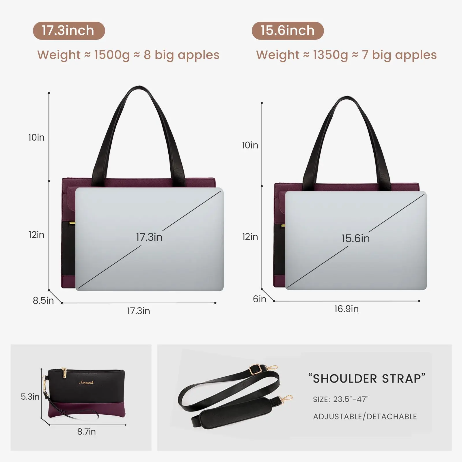 【Additional Clutch Bag】One more gift is a 8.7" L x 5.3" H detachable clutch purse. The additional small bag is made of soft PU leather, has smooth zippper on top closure, polyester lining inside. The purse can store change, snacks, glasses, earphones, passports, keys and cell phones.This bundle is the best gift for wife, girlfriend, mom ,daughter, families and friends.