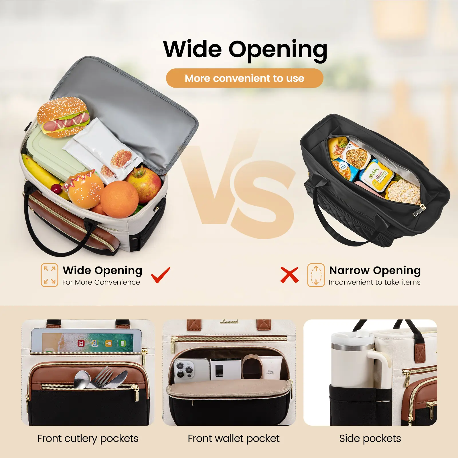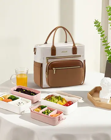 ·Innovative Wide Opening Design and Multiple Pockets: The top of the lovevook lunch bag adopts a large opening design, which is convenient for one-handed quick removal of lunch boxes, fruits, etc. Say goodbye to the "difficulty of reaching" of traditional narrow lunch bags. The three front pockets can hold daily necessities such as tableware, mobile phones, wallets, cosmetics, etc., and the two elastic pockets on the side can hold large water bottles.