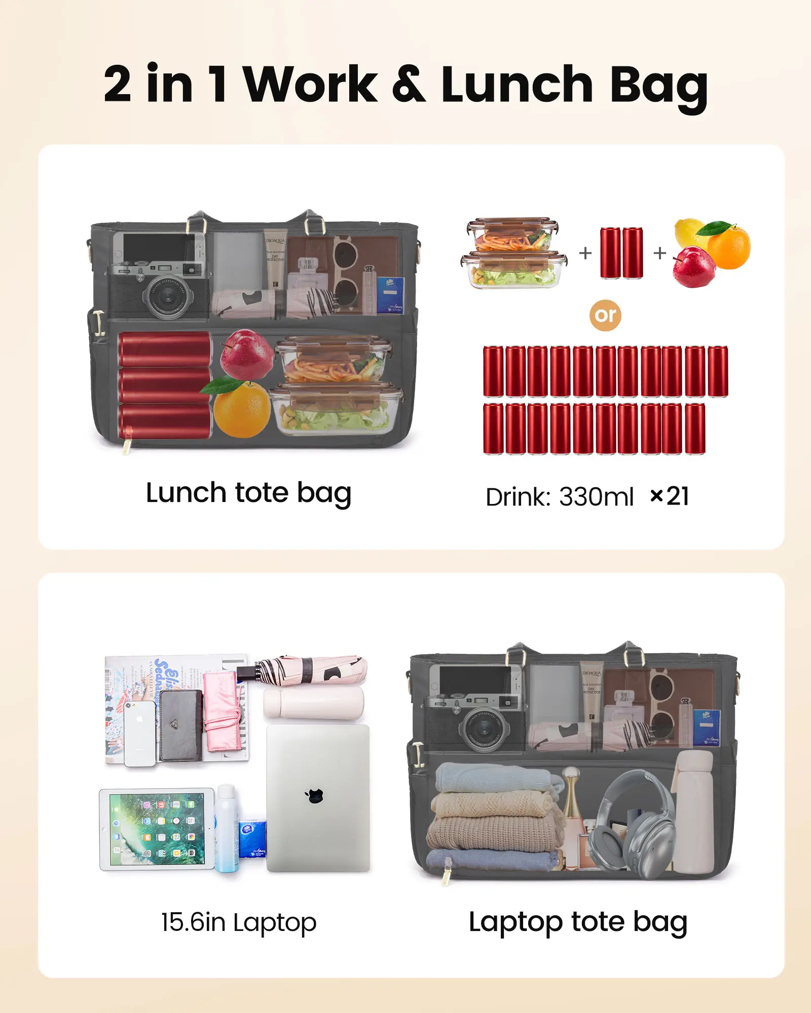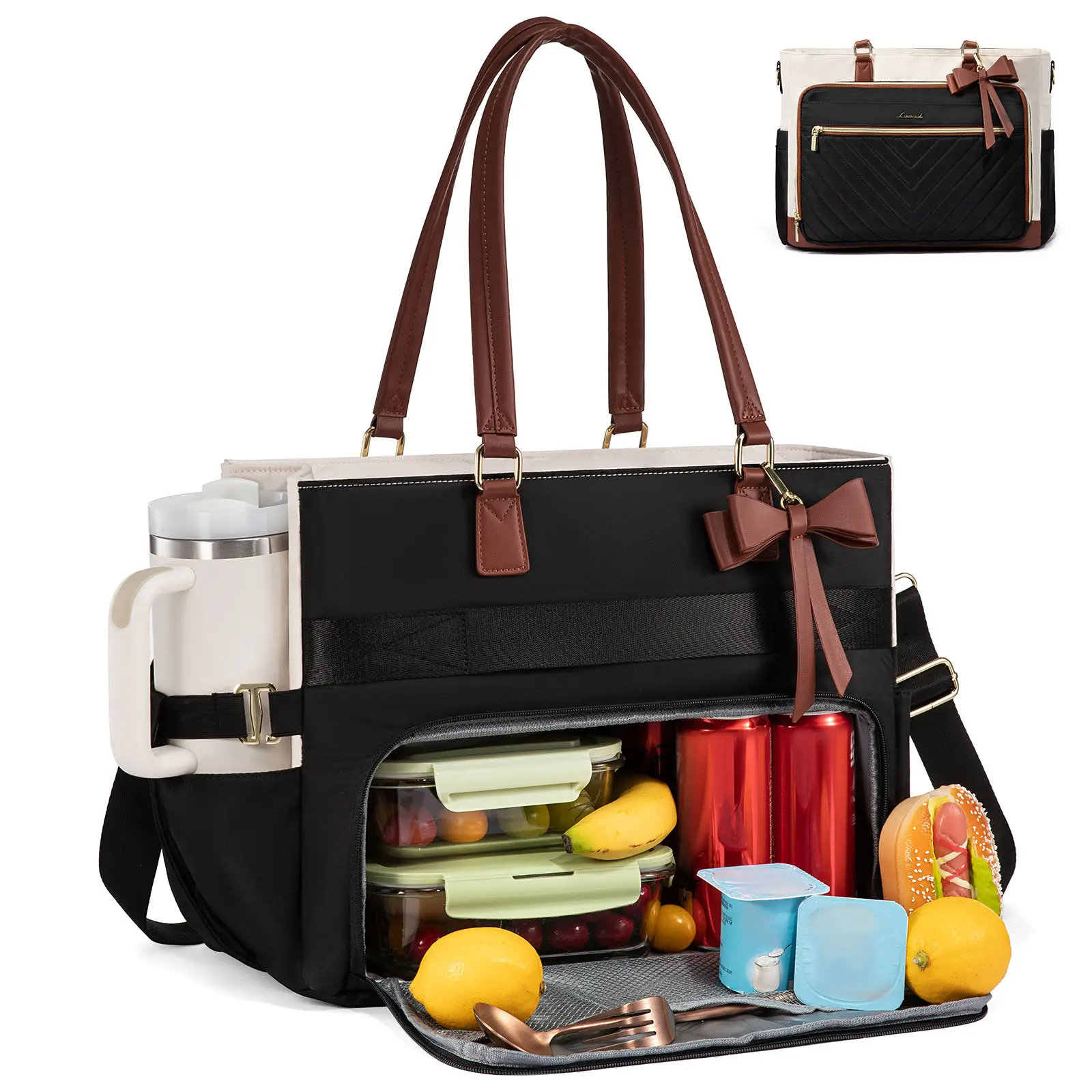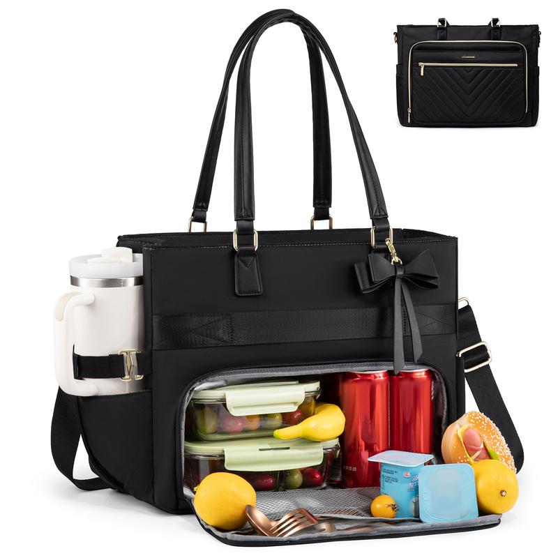 ·All-in-One Tote: Introducing the ultimate tote bag for women, a 2 in 1 tote bag lunch bag combo designed to cater to all your needs. This versatile tote bag comfortably fits a 15.6-inch or 17.3-inch laptop, while its insulated lunch bag section maintains your meal's temperature—keeping it warm for up to 5 hours, cold for 10, and fresh for 9. It’s the perfect work tote that transitions effortlessly from professional settings to personal errands.