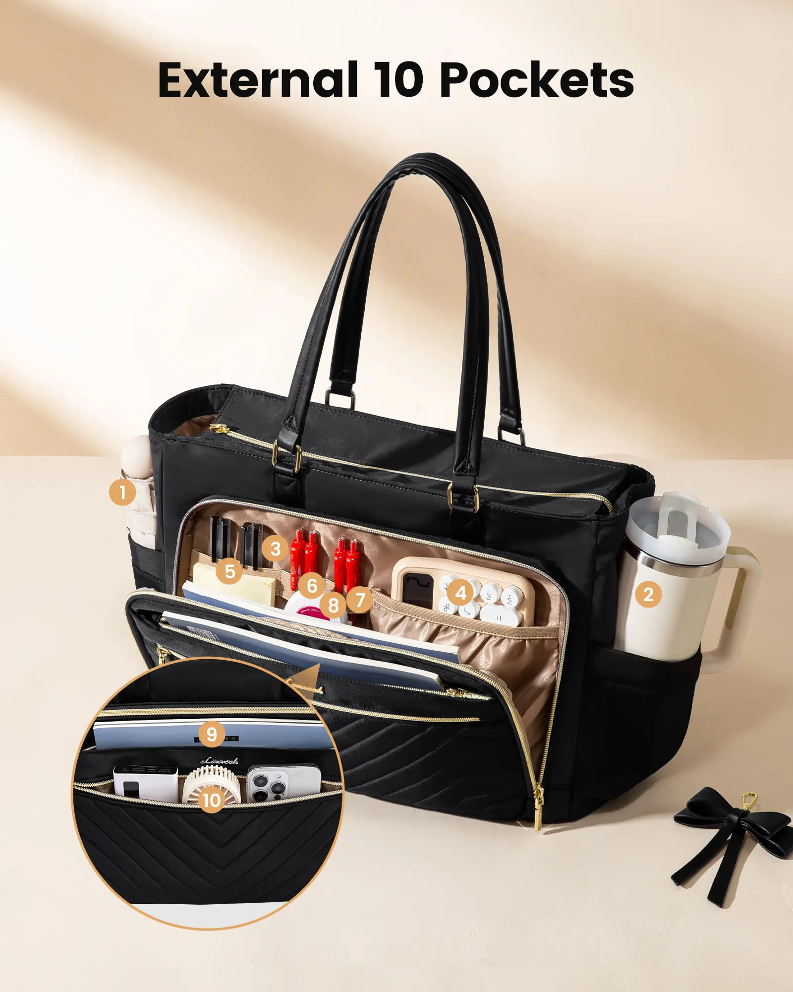 ·Large Capacity & Multiple Pockets: This large tote bag offers incredible organization with 17 distinct pockets, including a large cup holder capable of holding 40oz bottles. The padded laptop compartment secures your devices inside this laptop tote bag for women, while exterior pockets are perfect for items like umbrellas and other essentials. Whether you need a school tote bag or teacher bag, this design delivers on capacity without compromising style.
