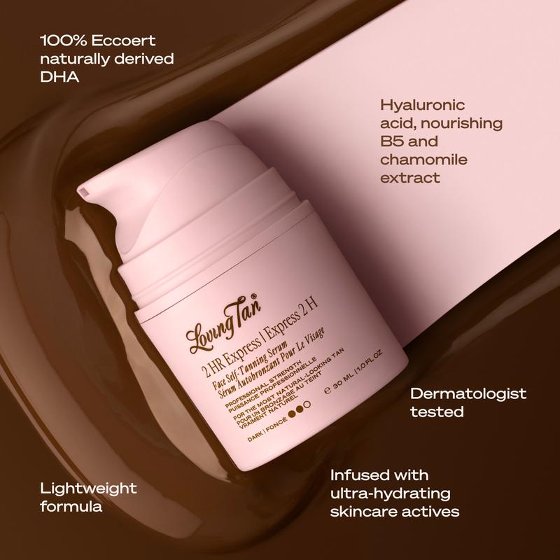 Included in this set is the skincare-infused 2 HR Express Face Tanning Serum Dark 30ml and Flawless Face Tan Brush.