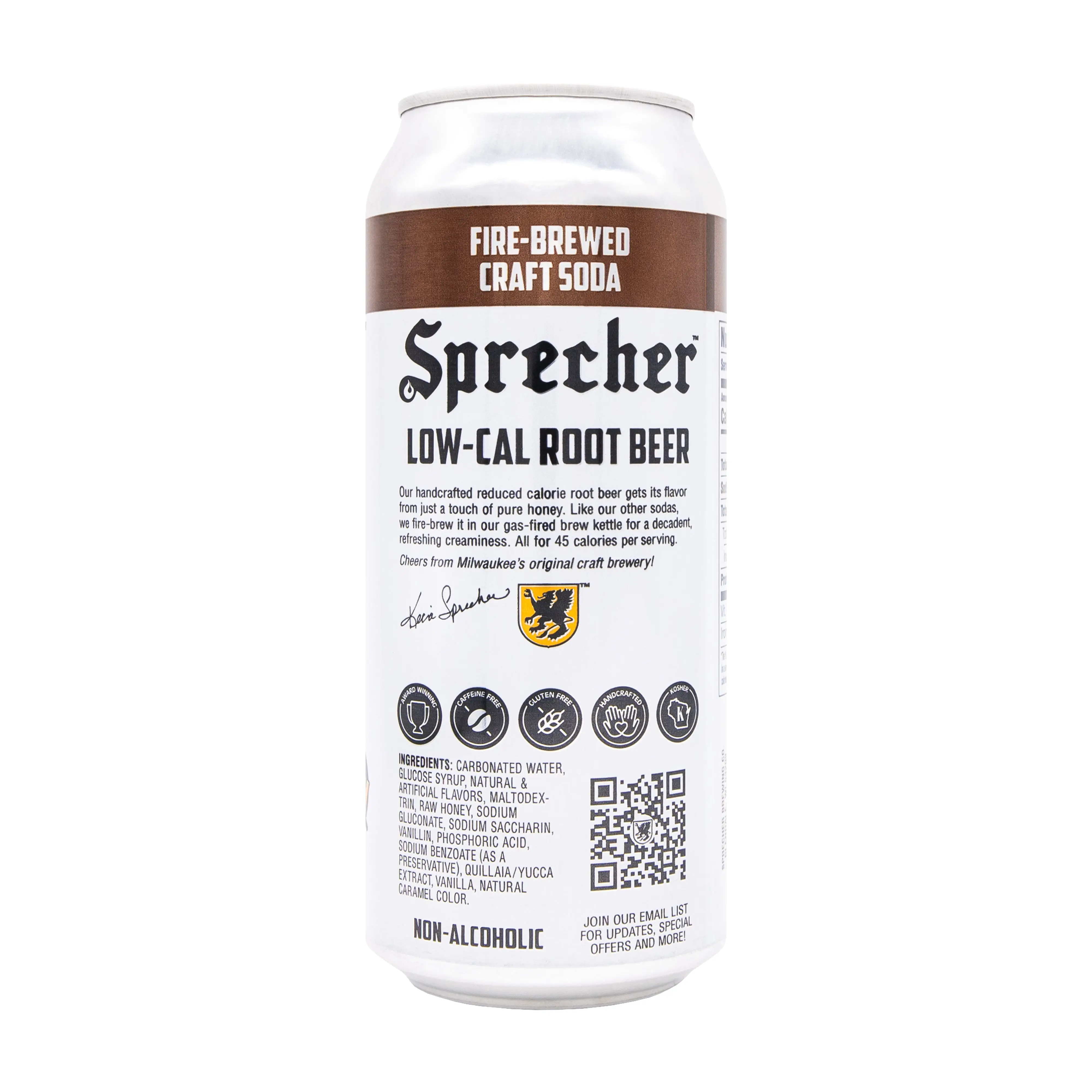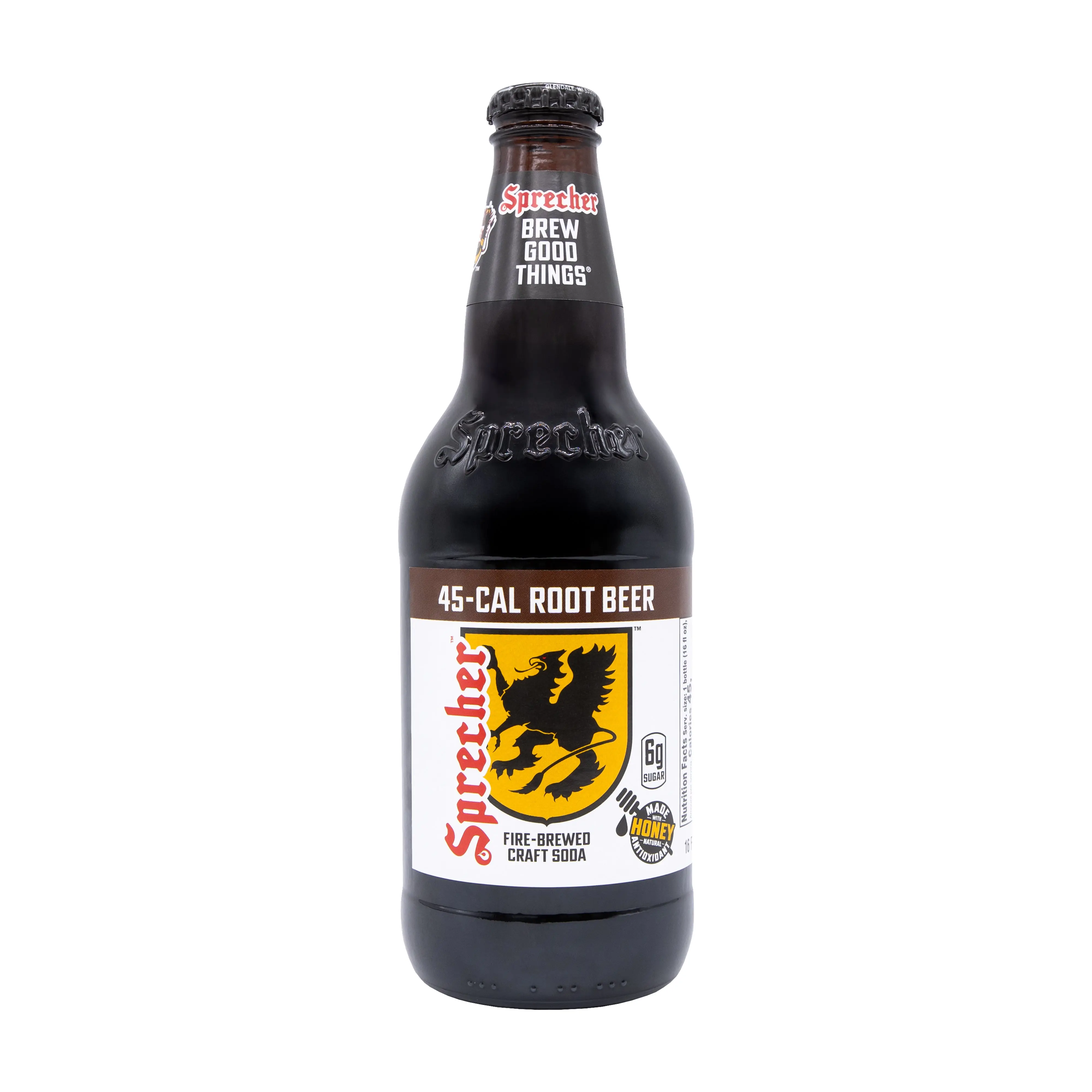 Sprecher Low-Cal Root Beer delivers the classic, fire-brewed richness of our regular Root Beer with significantly fewer calories, just 45 per 16-oz serving. Handcrafted with raw Wisconsin honey and natural flavors, this caffeine-free, gluten-free, and Kosher-certified soda offers creamy sweetness and bold root beer taste with less sugar.