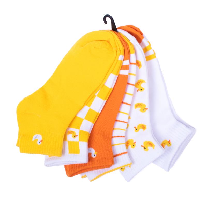 Introducing our Ladies' Assorted Low-Cut Duck 6 pre-pack Ribbed Socks-LN6F1645 a perfect blend of playfulness and style. This sock pack includes six pairs of socks with yellow prints in delightful orange tones, making them a standout accessory. The ribbed texture ensures a comfortable fit and long-lasting wear. Upgrade your inventory with these playful and stylish socks and provide your customers with a fashionable option for their feet