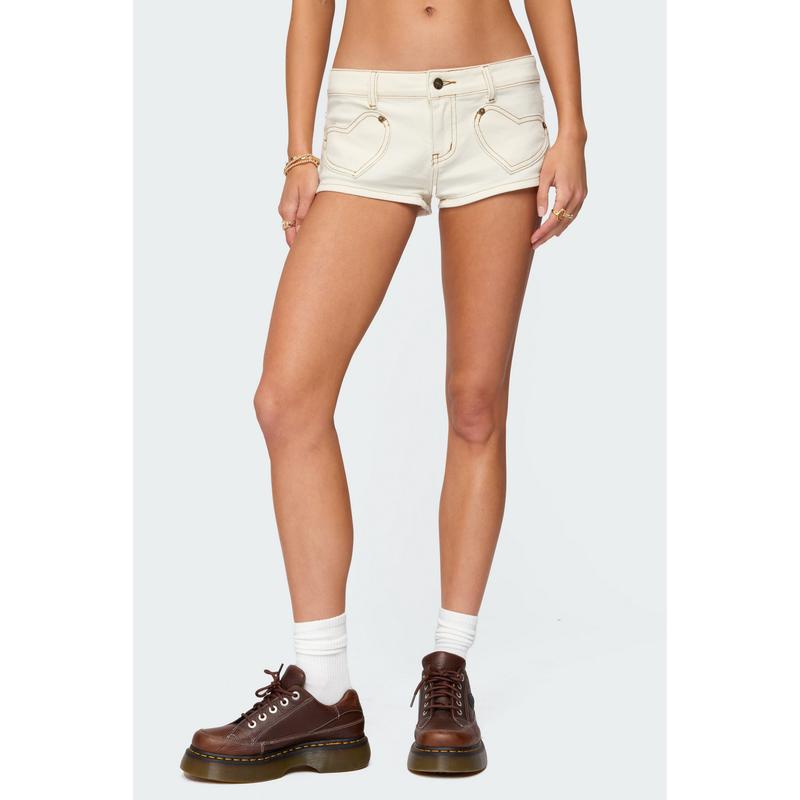 Cute lowrise shorts, thick material with stretch. the heart pockets are super cute, just very short in the back.