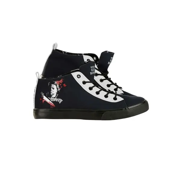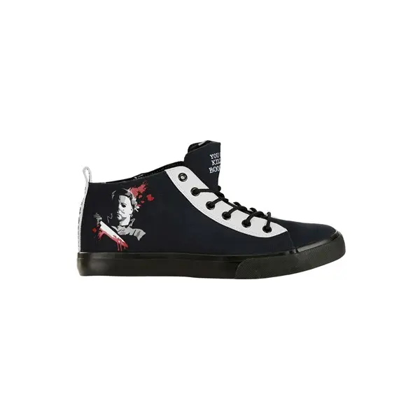 These exclusive shoes are an exclusive design, which features a simple, yet deadly print of Michael Myers on the side of the shoe. Michael is wielding his signature knife and has blood splatters around him for a truly gruesome effect. It also has white accents and a matching backstrap on the back. The tongue has the words "You Can't Kill the Boogeyman" on the front. You can wear them to get into the Halloween mood or add them to your everyday wear to add some horror flair to your outfit.
