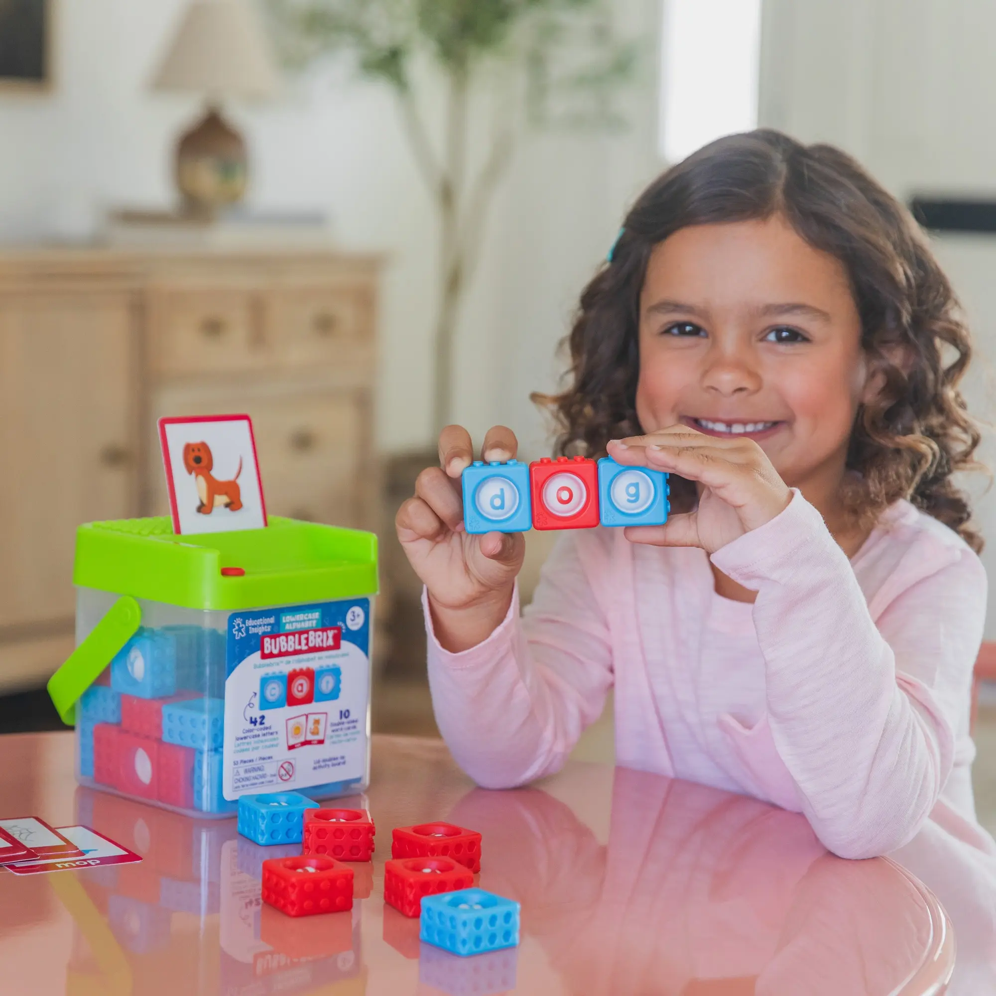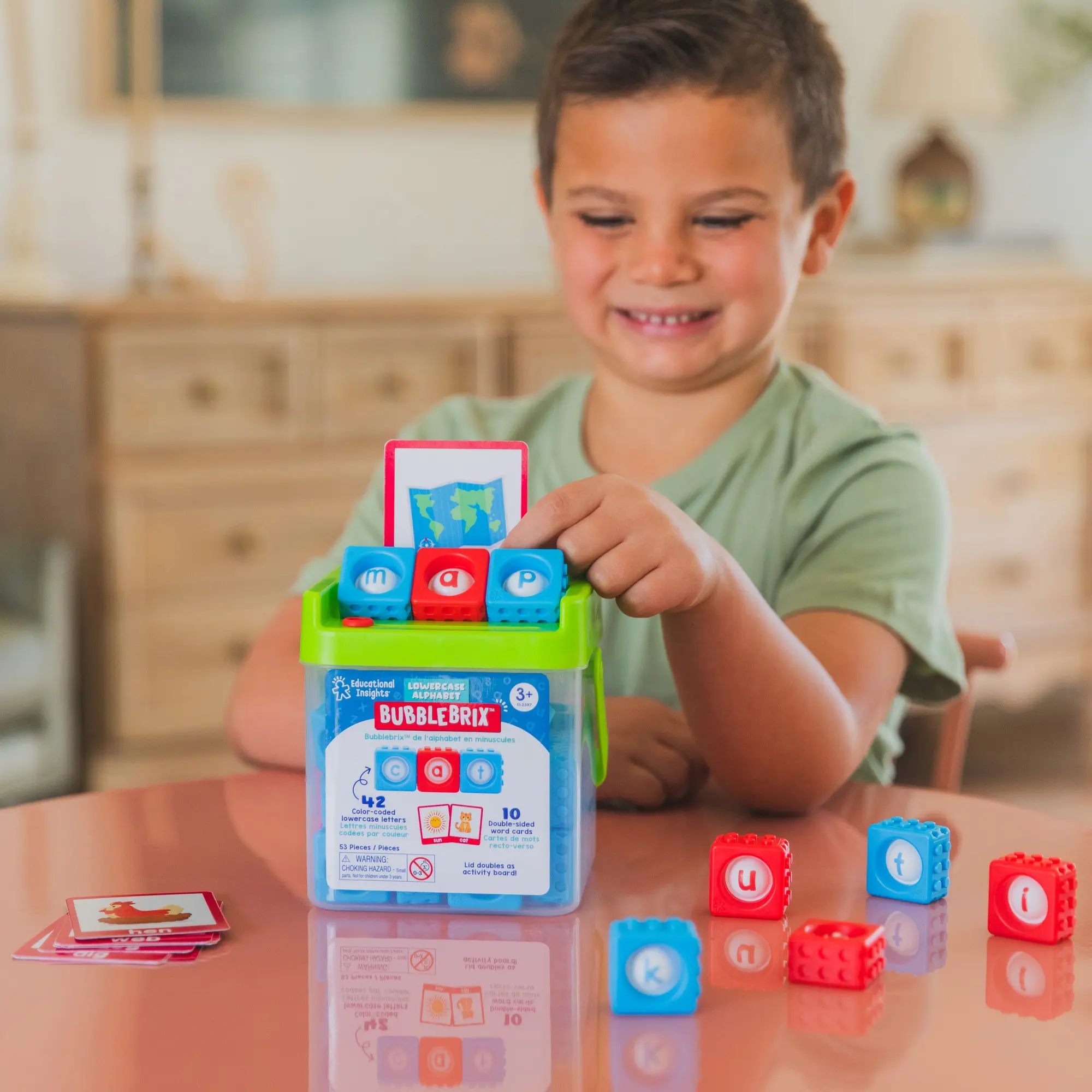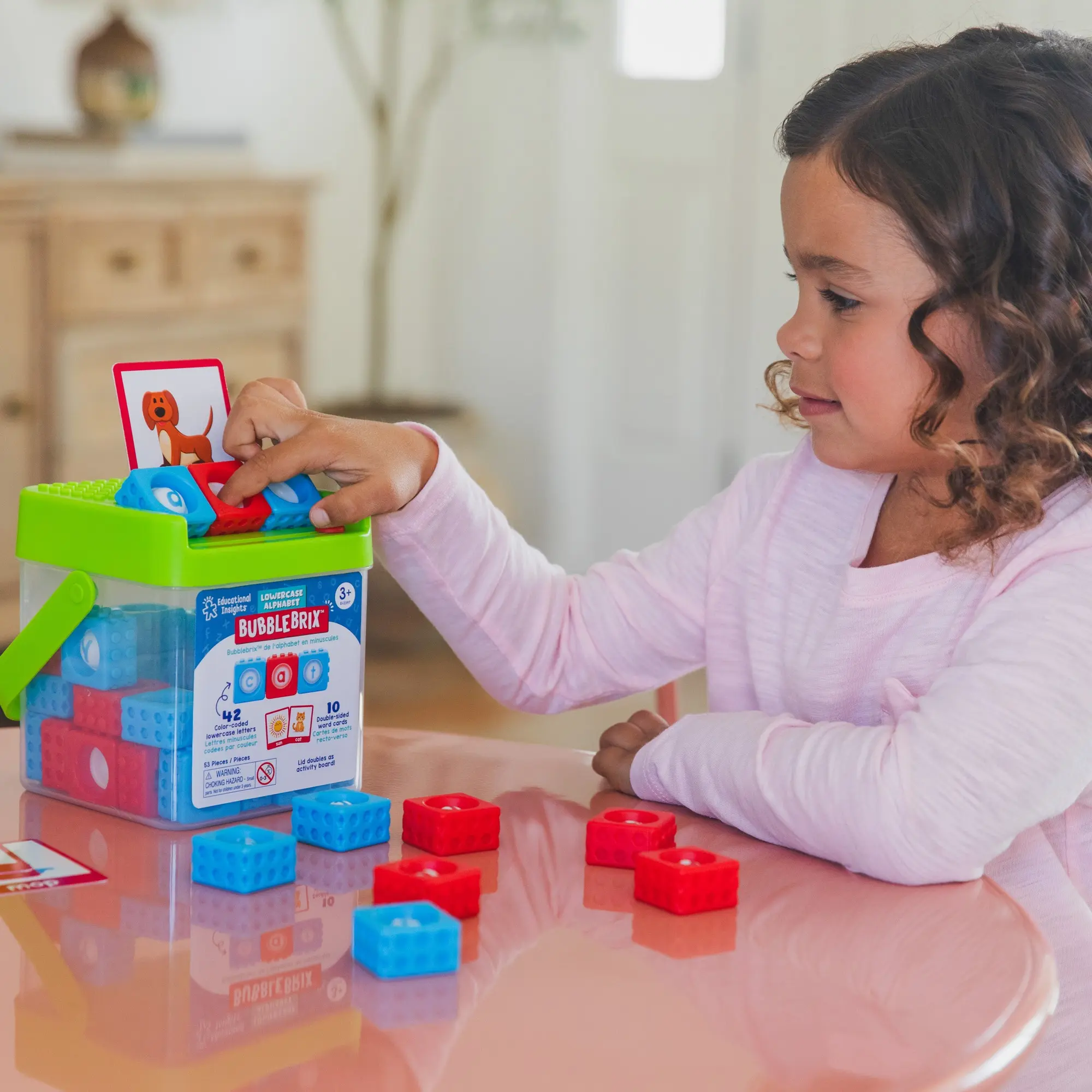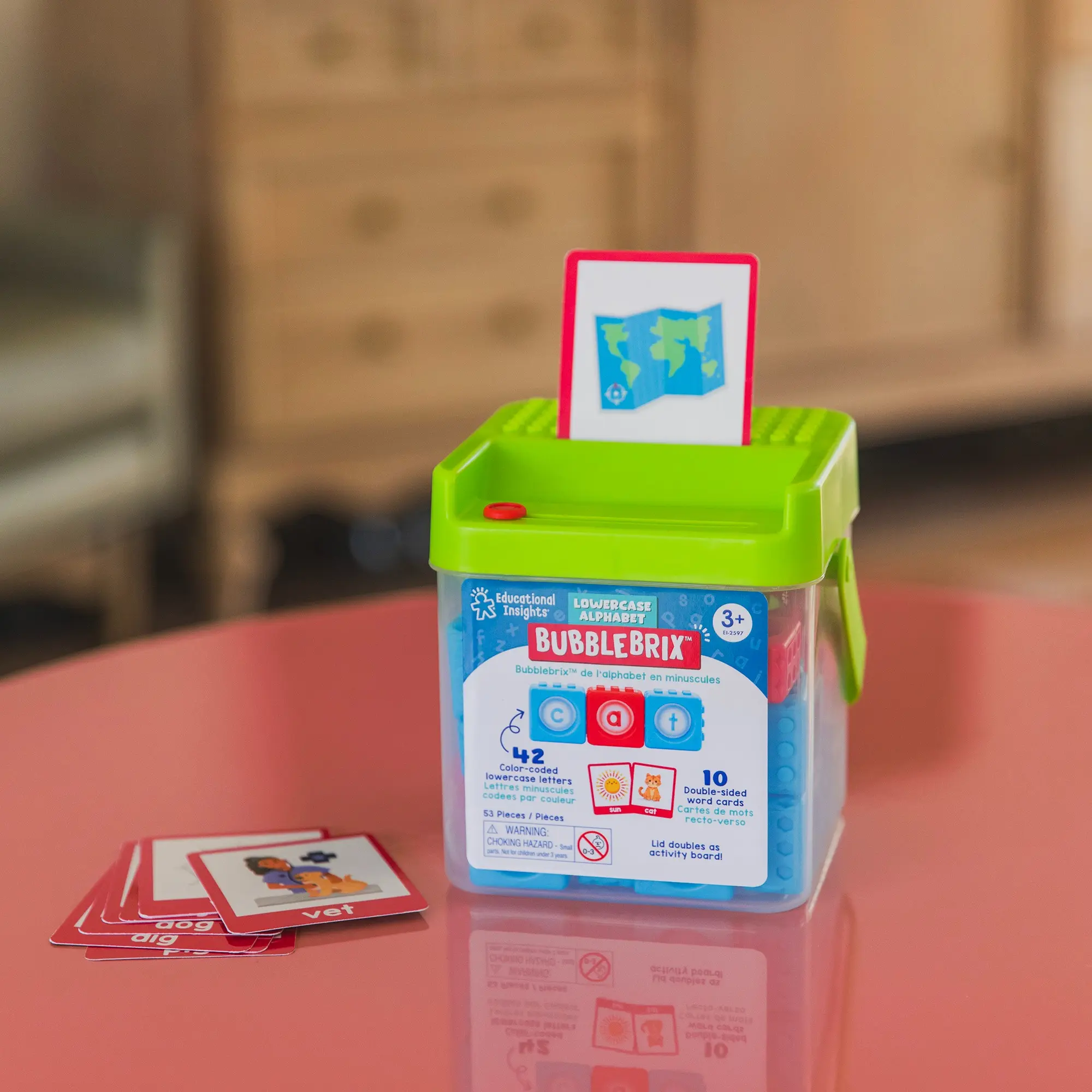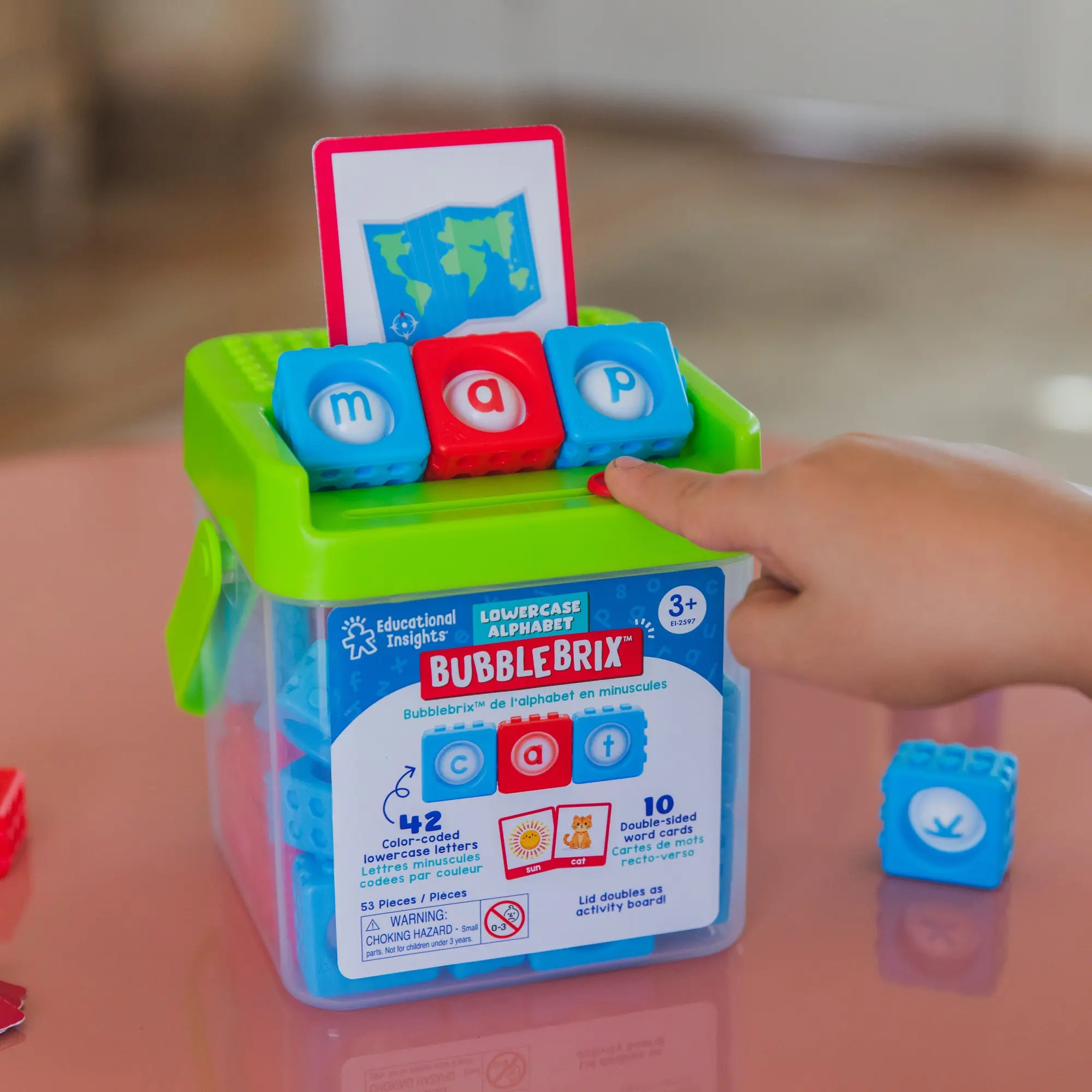 ·ABC Toy includes: 42 Color-coded BubbleBrix with lowercase letter bubbles (red vowels, blue consonants), 10 double-sided word cards, and storage bucket with lid that doubles as spelling activity board; for ages 3+