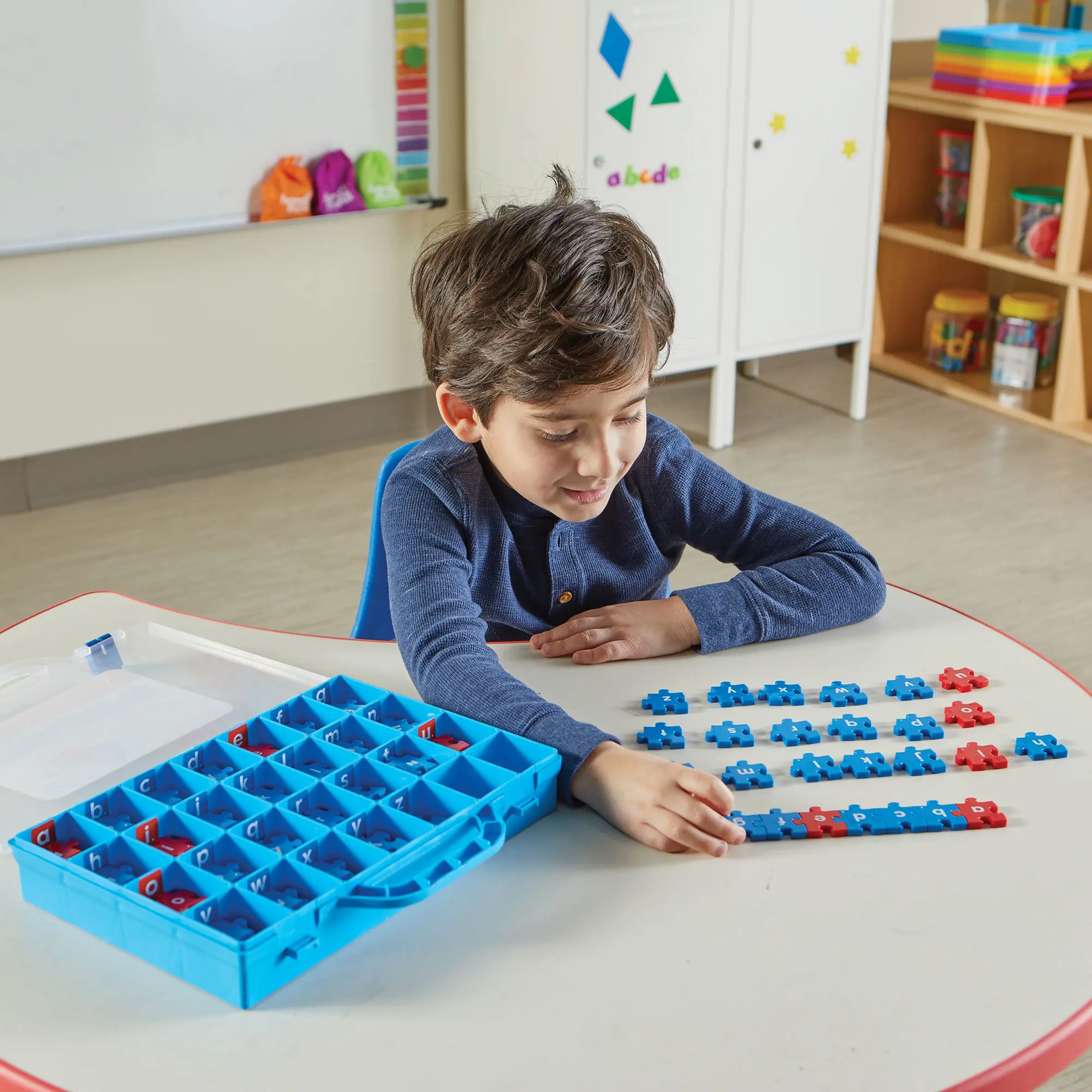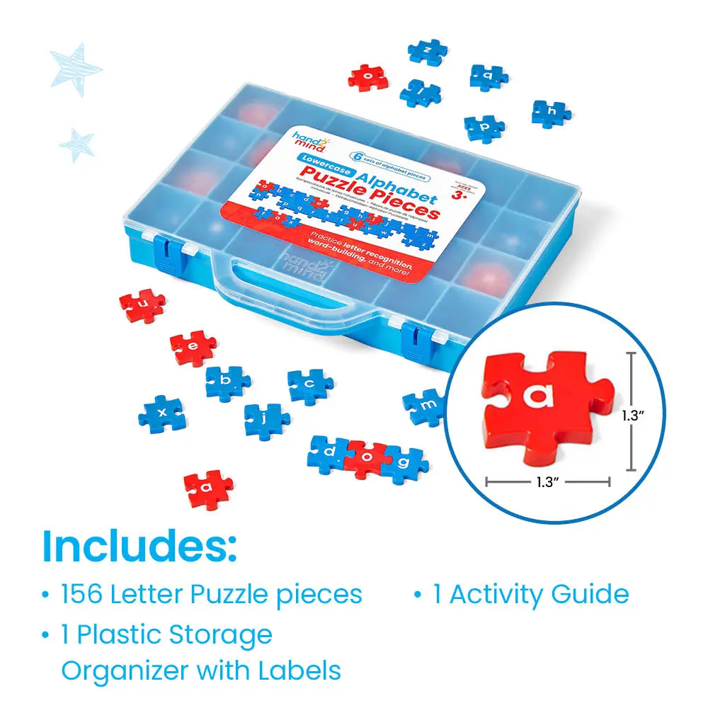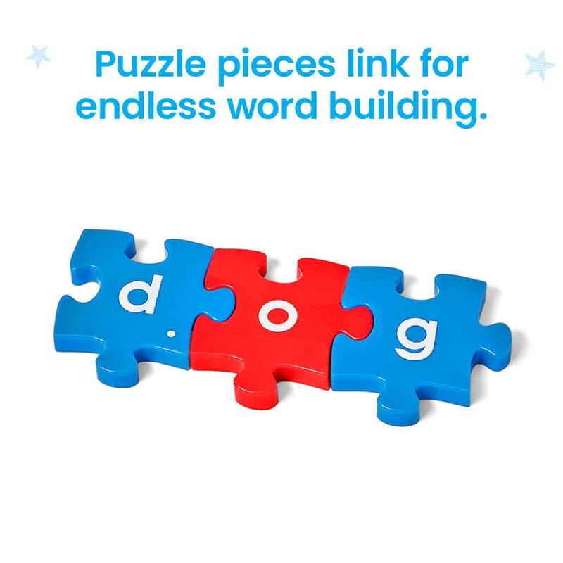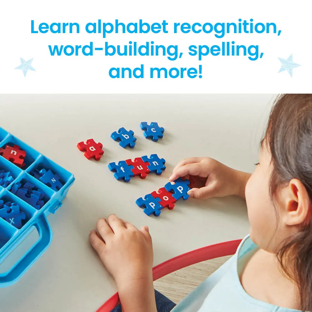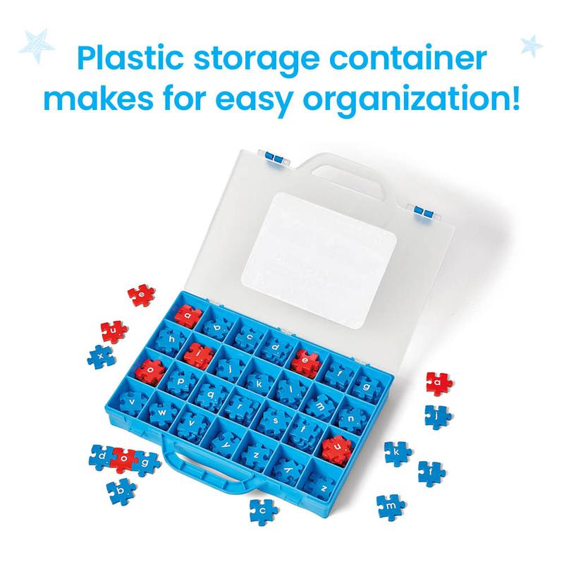 Practice letter recognition and creative word-building with these engaging Lowercase Alphabet Puzzle Pieces! Students will learn to spell and develop their fine motor skills with these hands-on manipulatives, building word after word with six sets of the lowercase alphabet. Durable puzzle pieces are color-coded to help young learners identify consonants (blue) and vowels (red). Puzzle pieces link together for easy word-building. Designed for classroom use, the individual puzzle pieces are made of durable plastic and come with a handy, labeled storage container for easy setup, organization, and cleanup. This set includes 156 Letter Puzzle Pieces (6 sets of the alphabet), 1 Plastic Storage Organizer with Labels, and an Activity Guide.