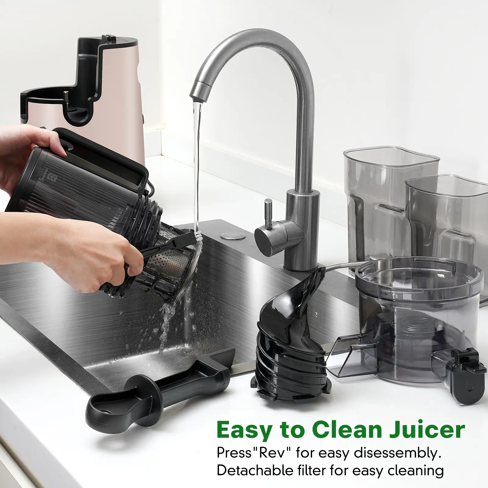 Featuring a double-layer fine filtration system, the juicer ensures silky-smooth, pulp-free juice while preventing clogging issues. The detachable filter makes post-juicing cleanup a breeze.