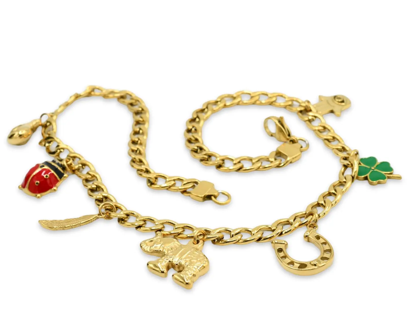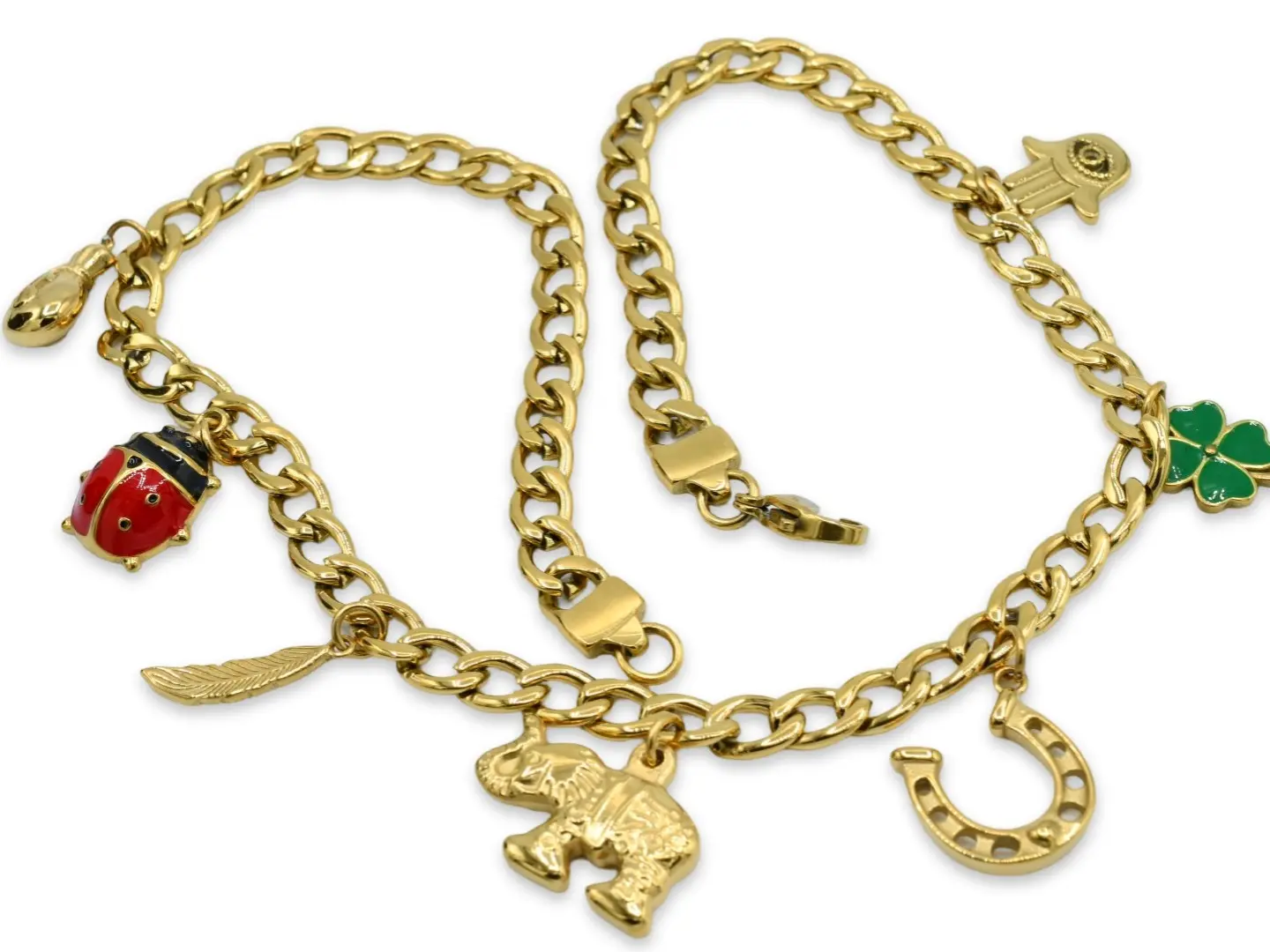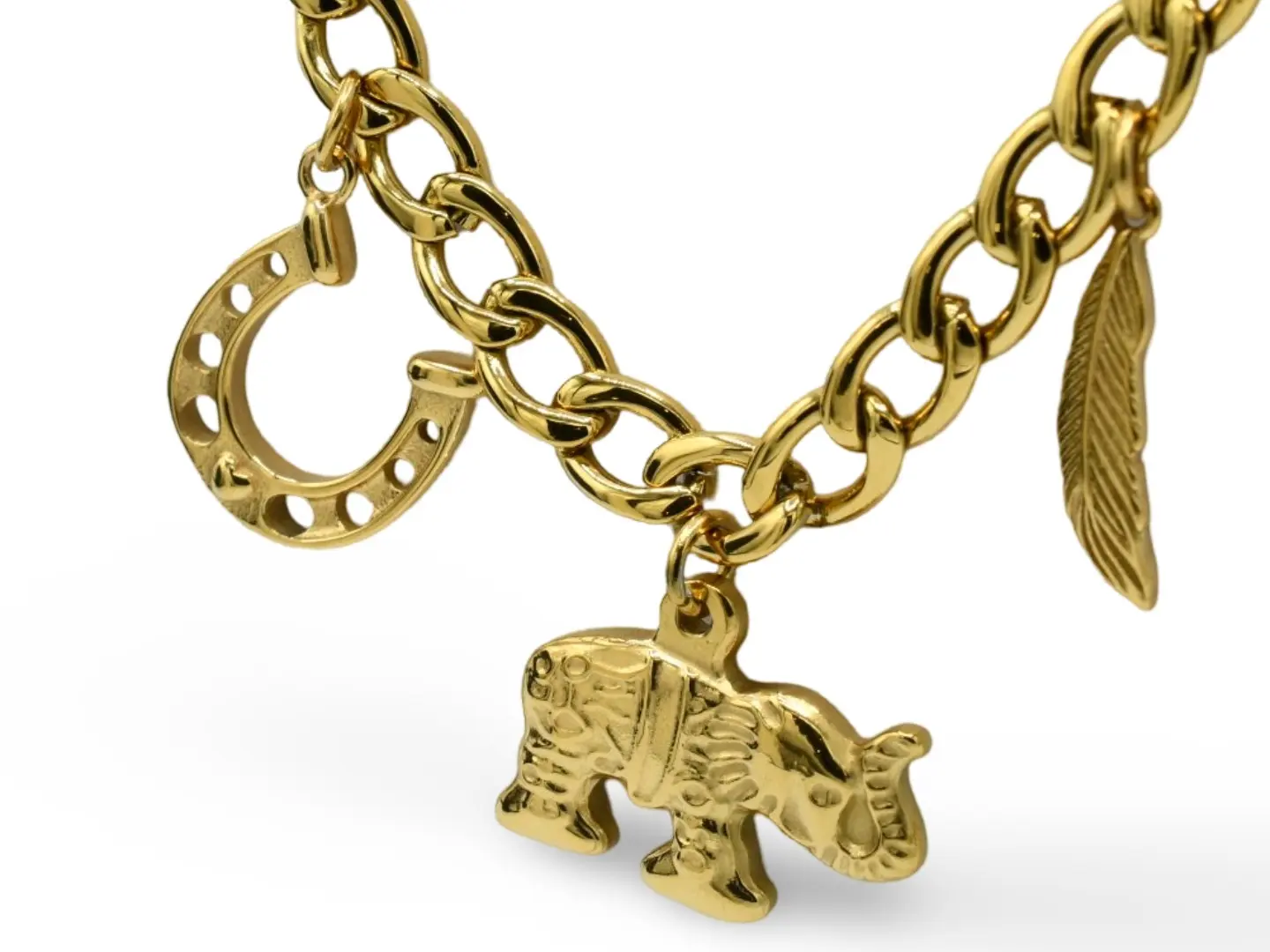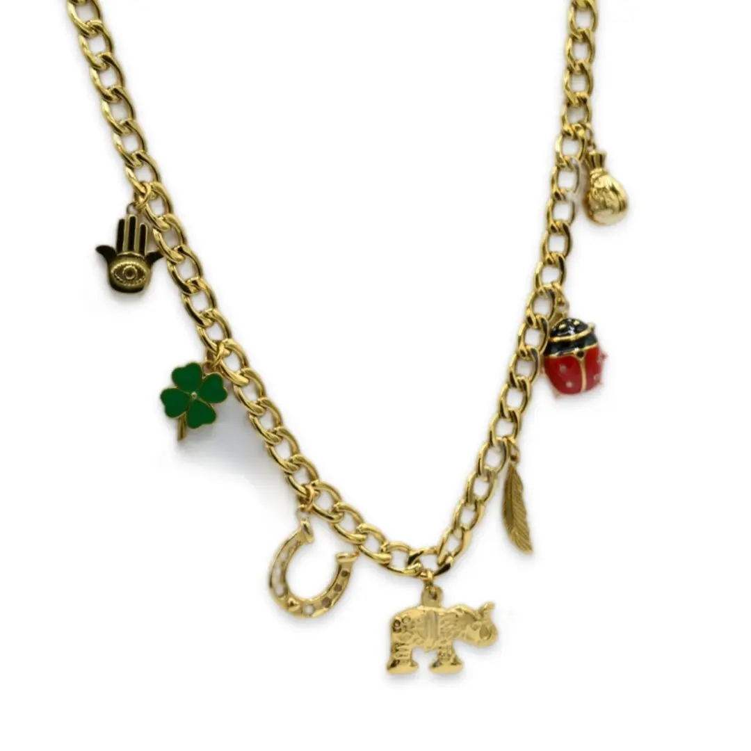 Bellos este collar y todos los charm que cuelgan bellos y el material se ve muy fino y no pesa .