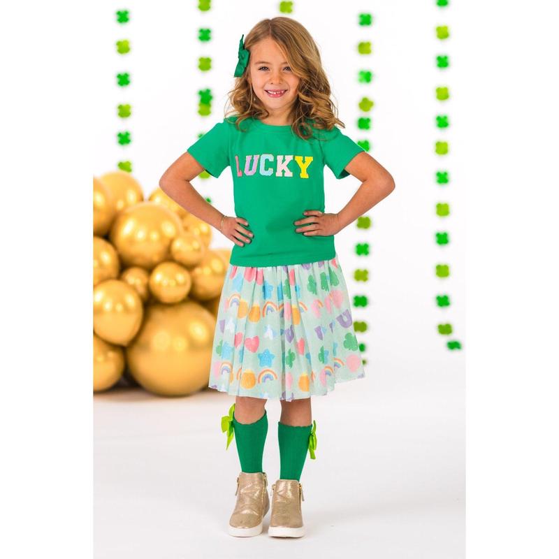 Your lucky little one will look so cute in this "Lucky" Charms Tutu Skirt Set. The green short sleeve top features a chenille patch on the front and looks adorable paired with the matching tutu skirt. The stretch waistband provides a secure fit for all-day comfort, while the lucky charm print adds a sweet touch. She can pair this set with booties or our SIP bows for the perfect St. Patrick's Day look!
