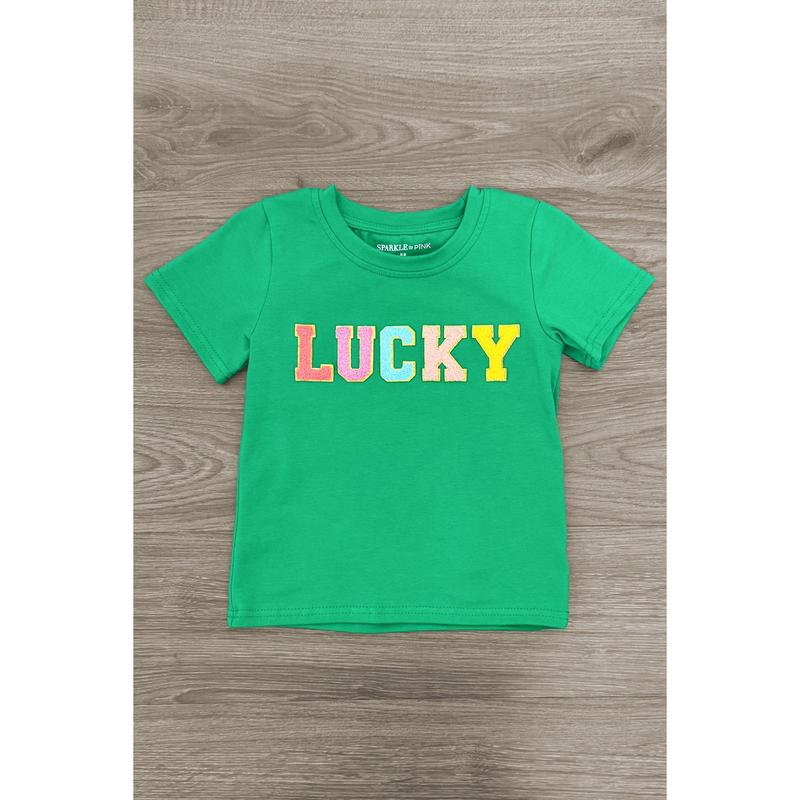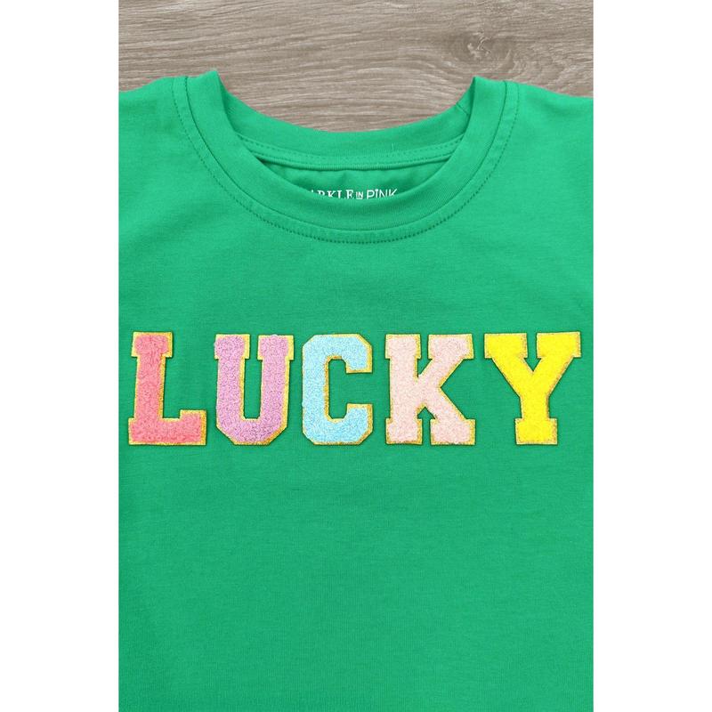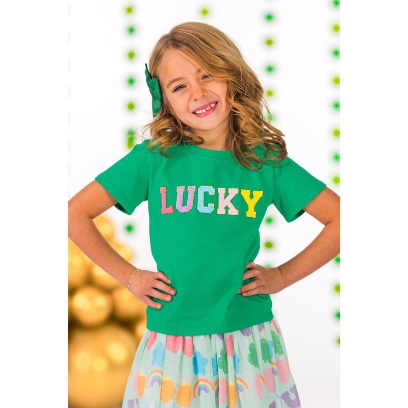 ·Short sleeve top features a rainbow "Lucky" chenille patch on the front