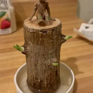 I've had this "Brazilian lucky wood" for one month now. Just the other day I noticed mold forming on the waxed side! No sign of plant growth. The only reason I gave this 2 stars is bc I like the little figure it came with. Otherwise this is junk, save your money!