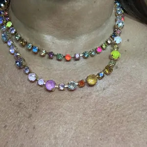 I bought this and the Avalyn. Very pretty with lots of sparkle, but I don’t think the Lucy lays well on the neck, especially @ 16in. Not sure they were worth the price either. They do both go nicely together. Watch putting them on, as they will rip the hairs on the back of the neck..ouch!