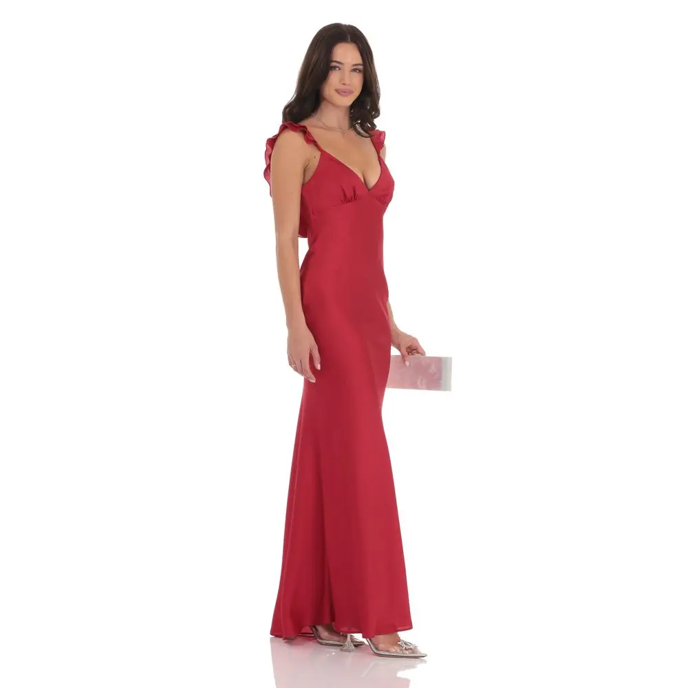 Satin Ruffle Open Maxi Dress in Red