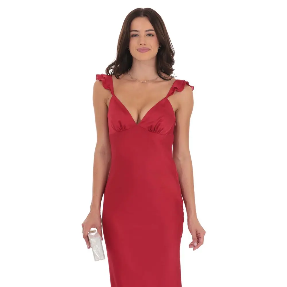 5. Satin Ruffle Open Maxi Dress in Red
