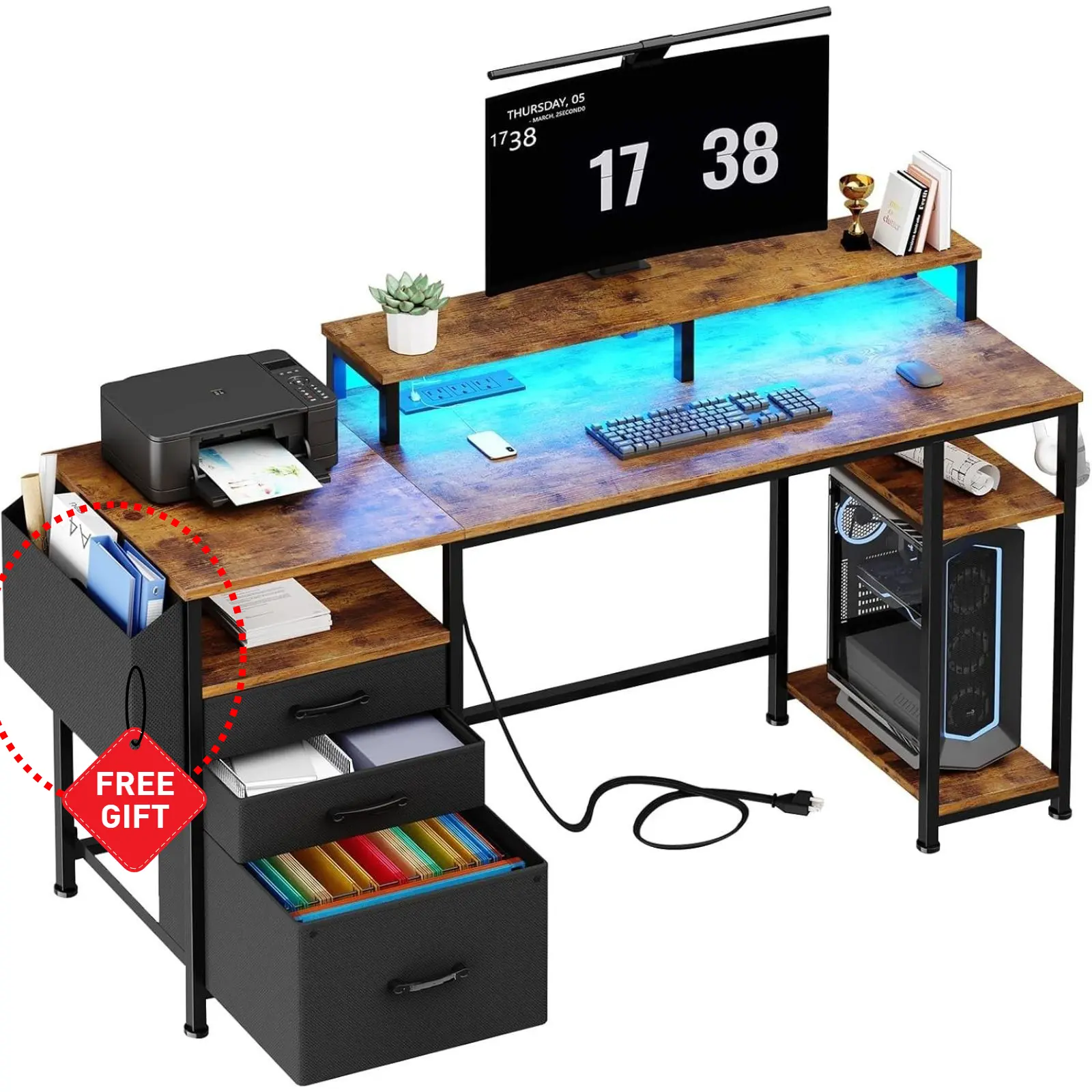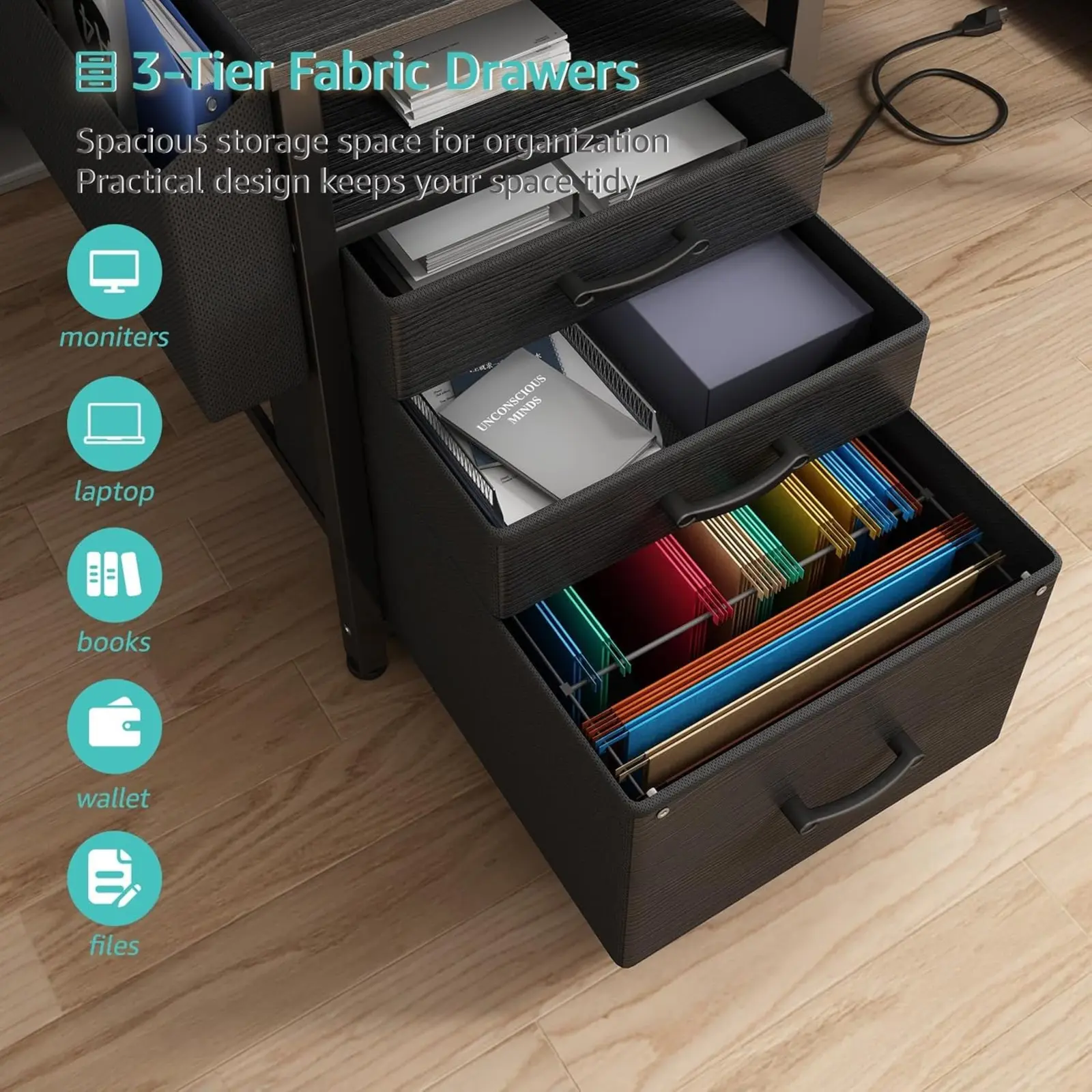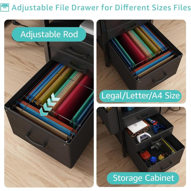 ·Versatile File Cabinet And Drawers: Computer desk with 3 𝙁𝙖𝙗𝙧𝙞𝙘 𝘿𝙧𝙖𝙬𝙚𝙧𝙨, the addition of this feature renders the desk lightweight and facilitates its mobility. One versatile file cabinet keep everything you need well organized and easily accessible, the adjustable file drawer is suitable for hanging legal size or letter size files. Two small drawers offers storage solution to your home office supplies.
